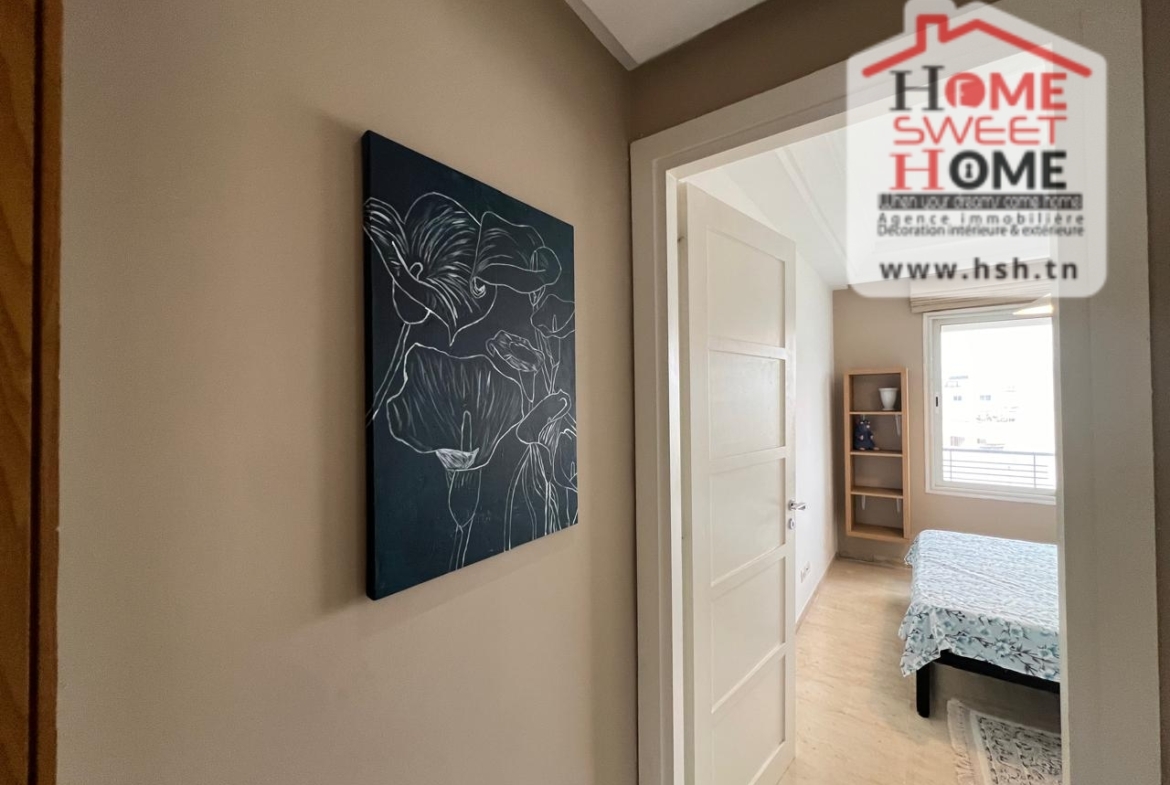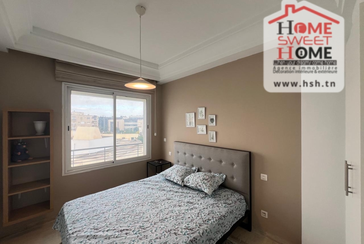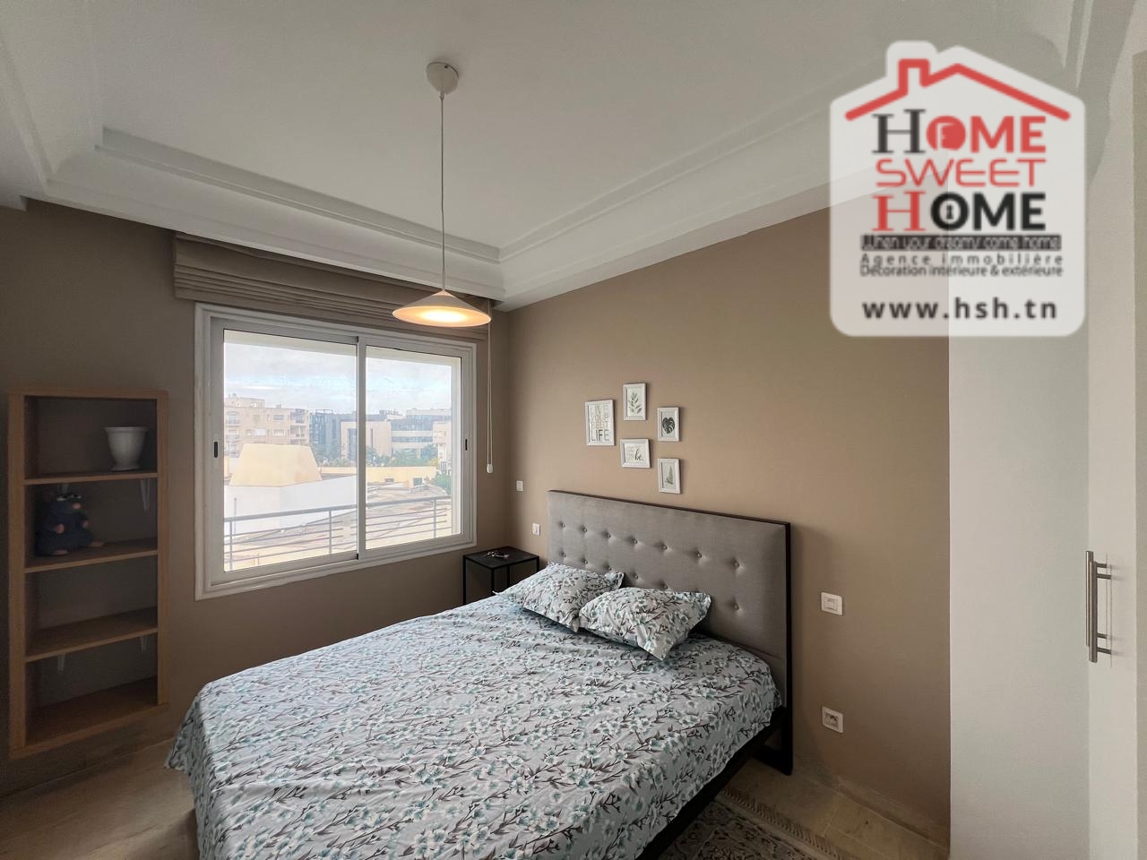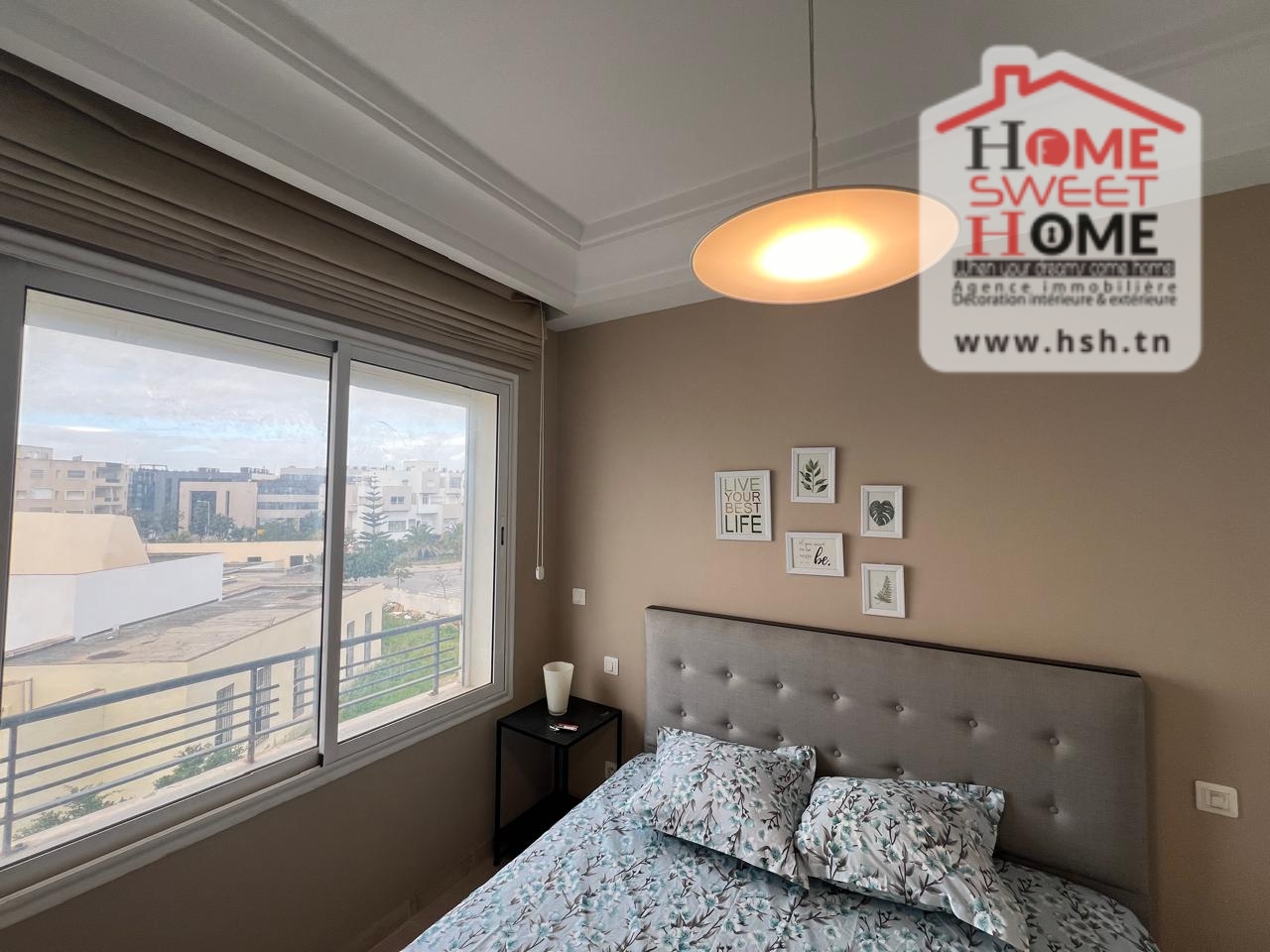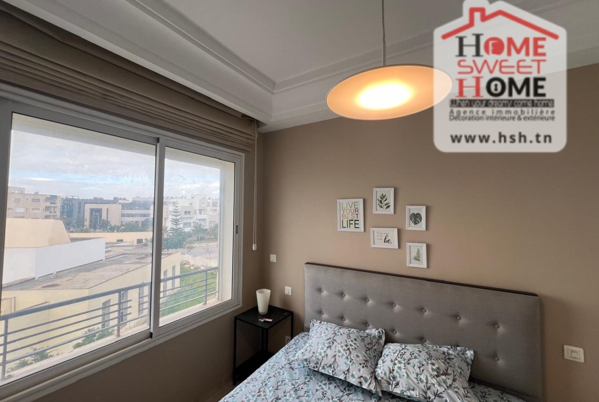 Un Appart haut standing au 3 éme étage situé au Berges du Lac 2. A l’entrée, on a une cuisine équipée ouverte sur un salon, une chambre à coucher et une salle de bain. A l’extérieur, on a une place de parking sous-sol.