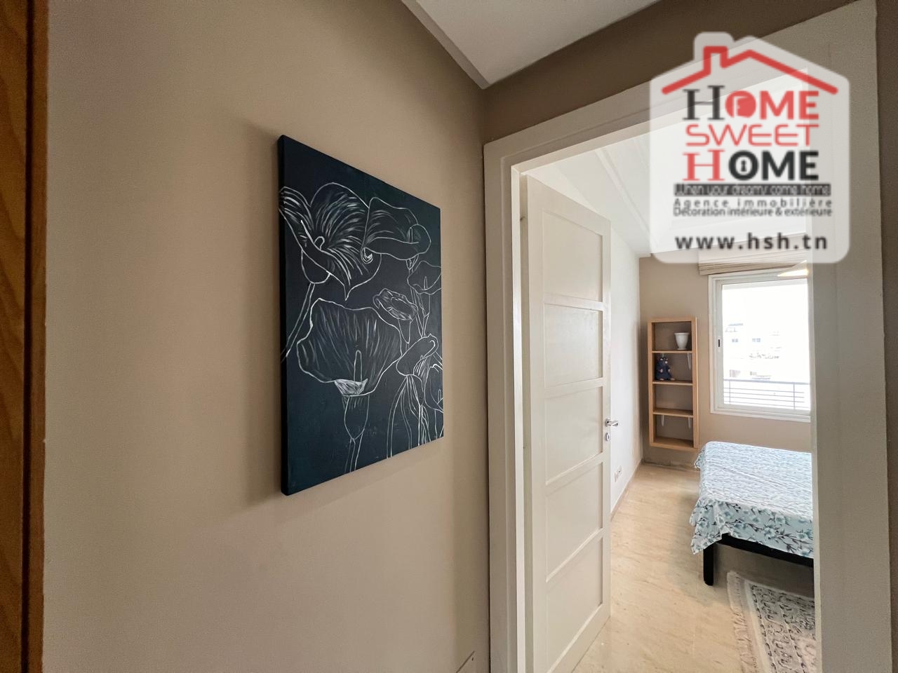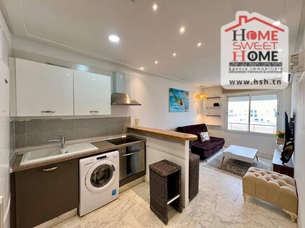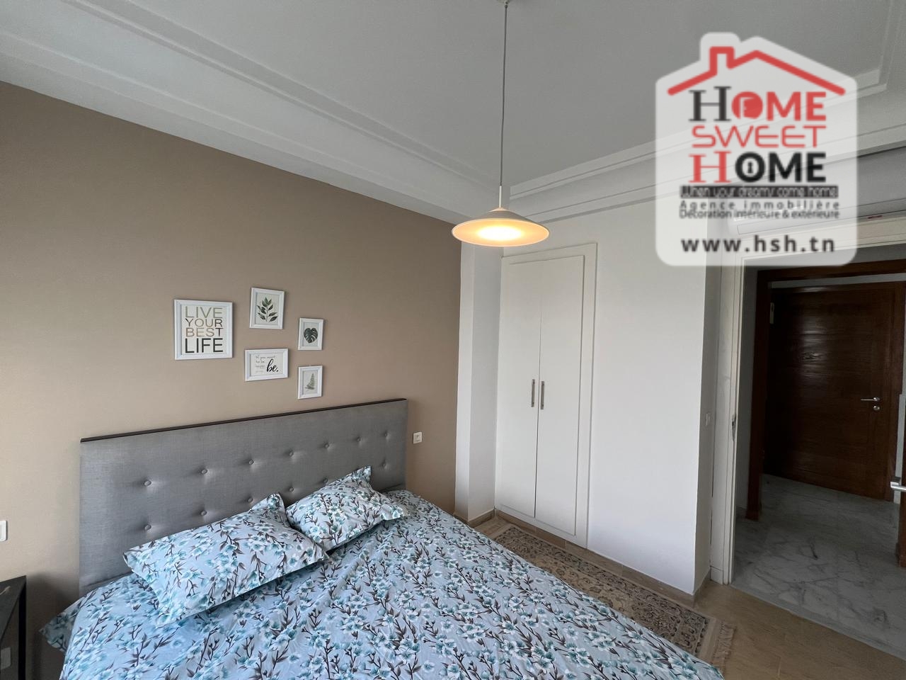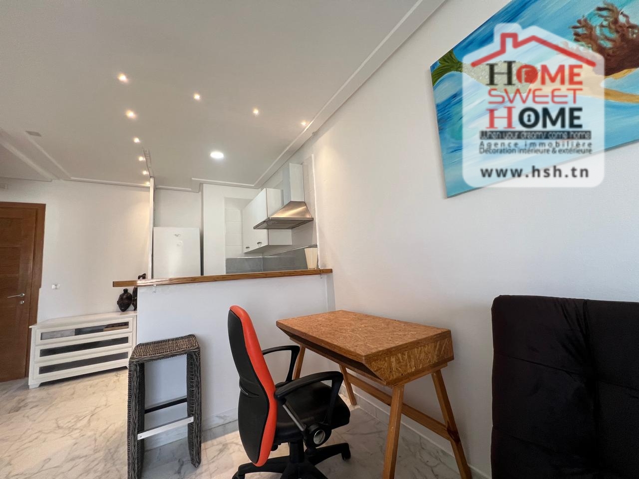 Un Appart haut standing au 3 éme étage situé au Berges du Lac 2. A l’entrée, on a une cuisine équipée ouverte sur un salon, une chambre à coucher et une salle de bain. A l’extérieur, on a une place de parking sous-sol.