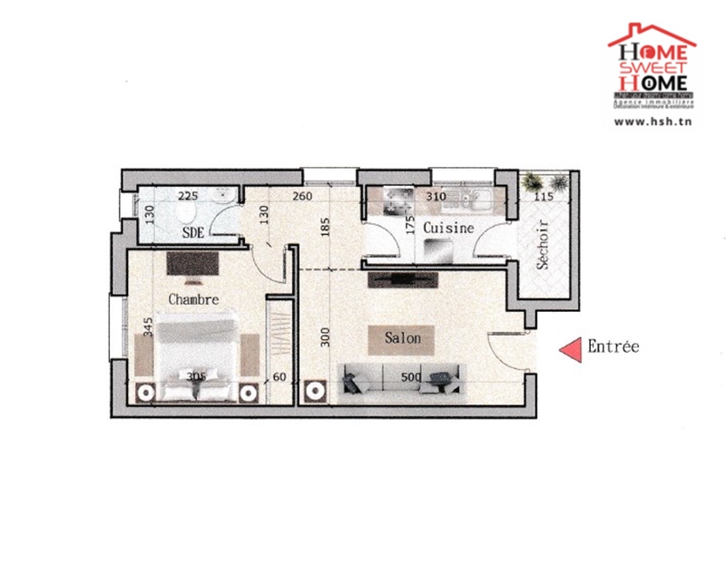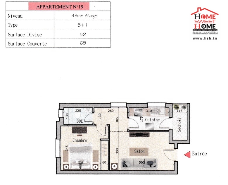 | Appartement S+1 d’une superficie de 69 m², situé au 4éme étage d’une résidence de haut standing à Hammam Chatt. Il se compose à l’entrée d’un salon, d’une cuisine équipée avec séchoir, d’une chambre à coucher et d’une salle de bain. Un ascenseur et une place de parking sont disponibles. Pour plus de renseignements, contacter l’agent au 56640310. |