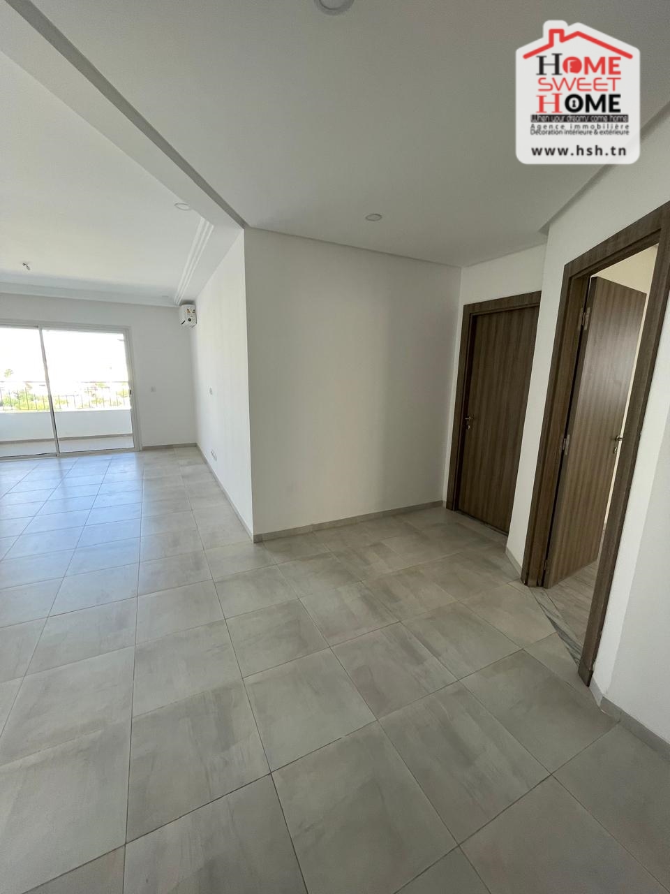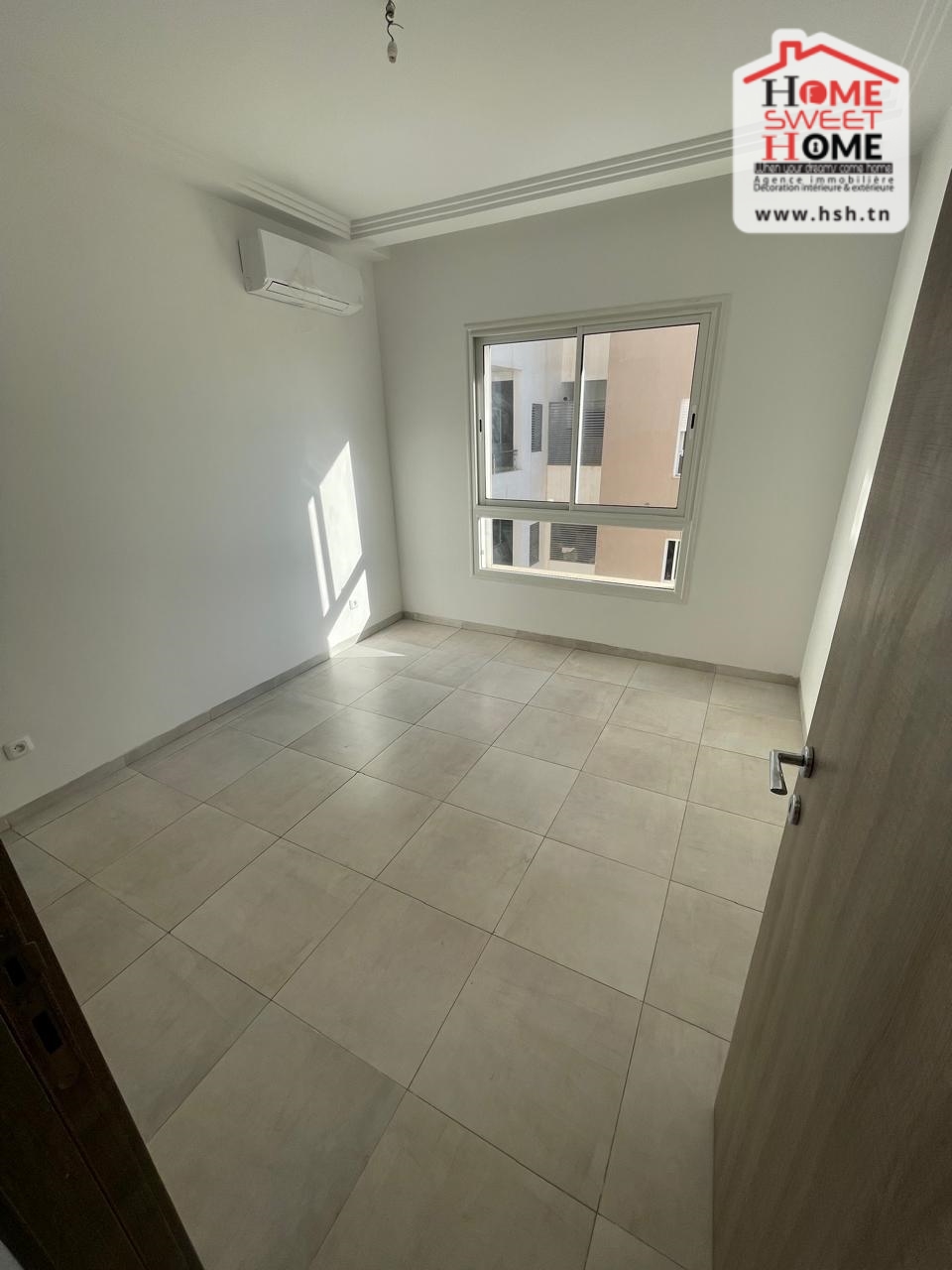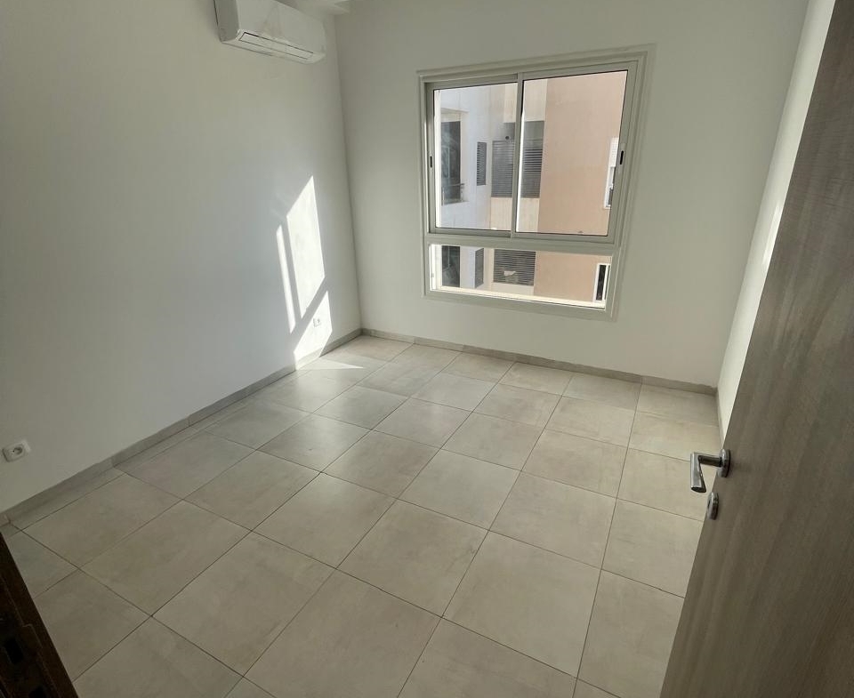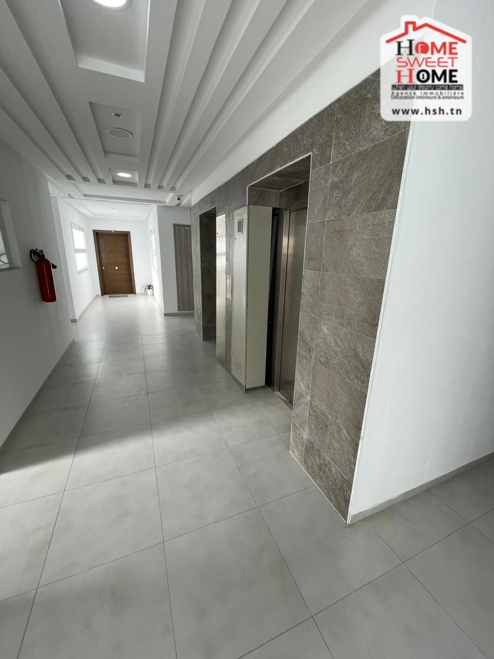 Un appart au 6éme étage situé dans une résidence luxueuse à Cité EL Ghazela, Ariana. A l’entrée , on a un salon, salle à manger avec balcon, une cuisine équipée avec séchoir, 2 chambres avec placard donnant sur un balcon et une salle de bain.