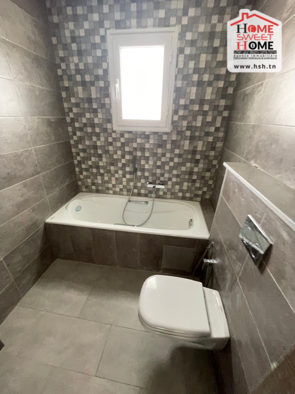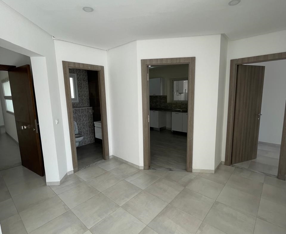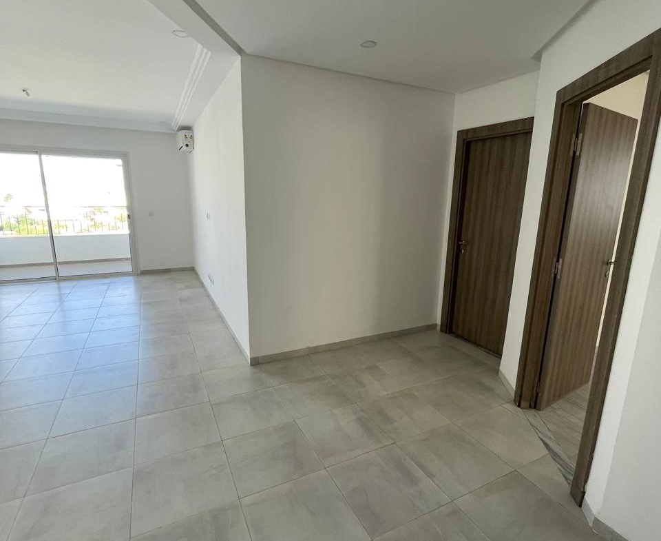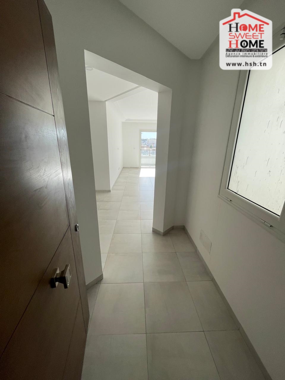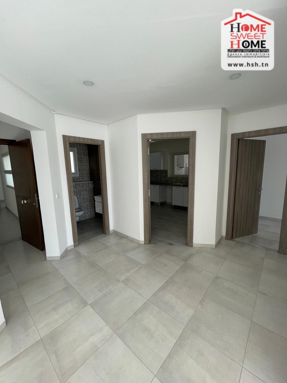 Un appart au 6éme étage situé dans une résidence luxueuse à Cité EL Ghazela, Ariana. A l’entrée , on a un salon, salle à manger avec balcon, une cuisine équipée avec séchoir, 2 chambres avec placard donnant sur un balcon et une salle de bain.