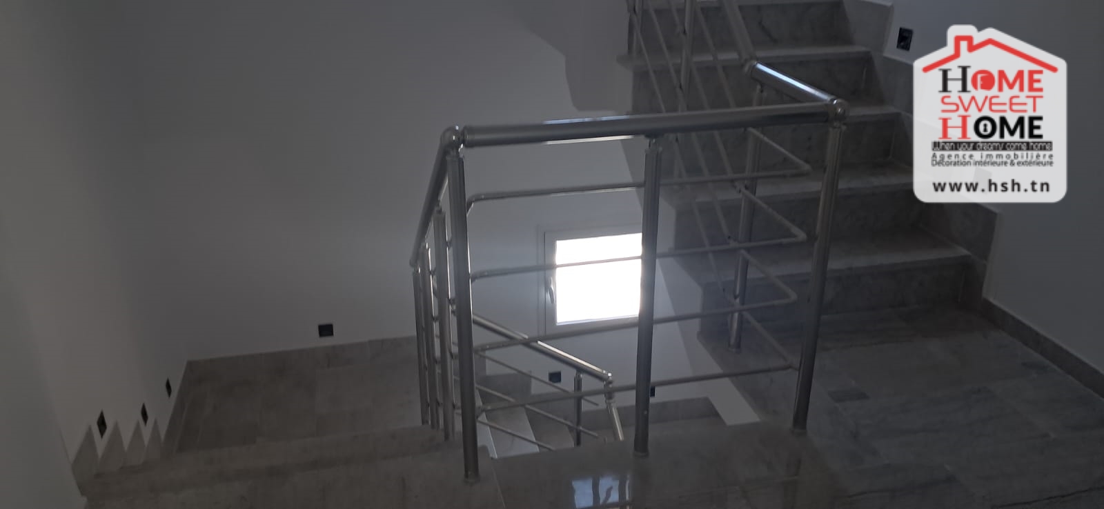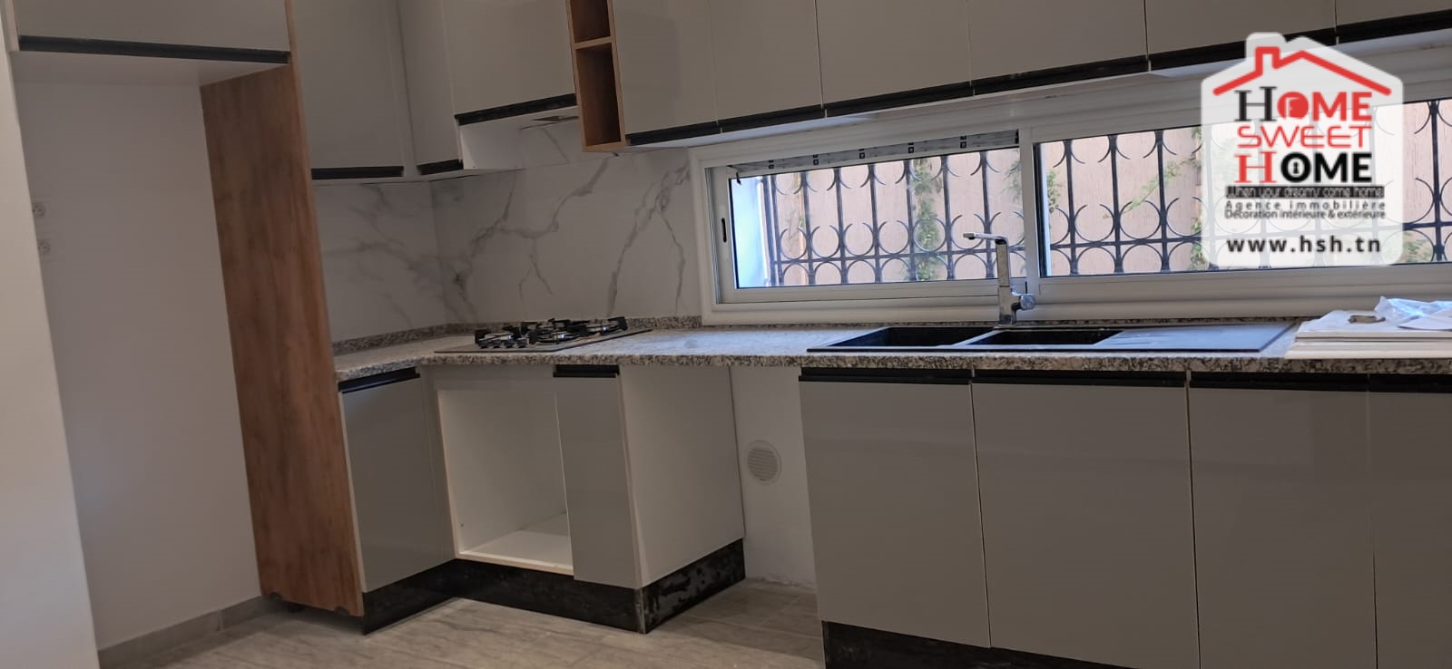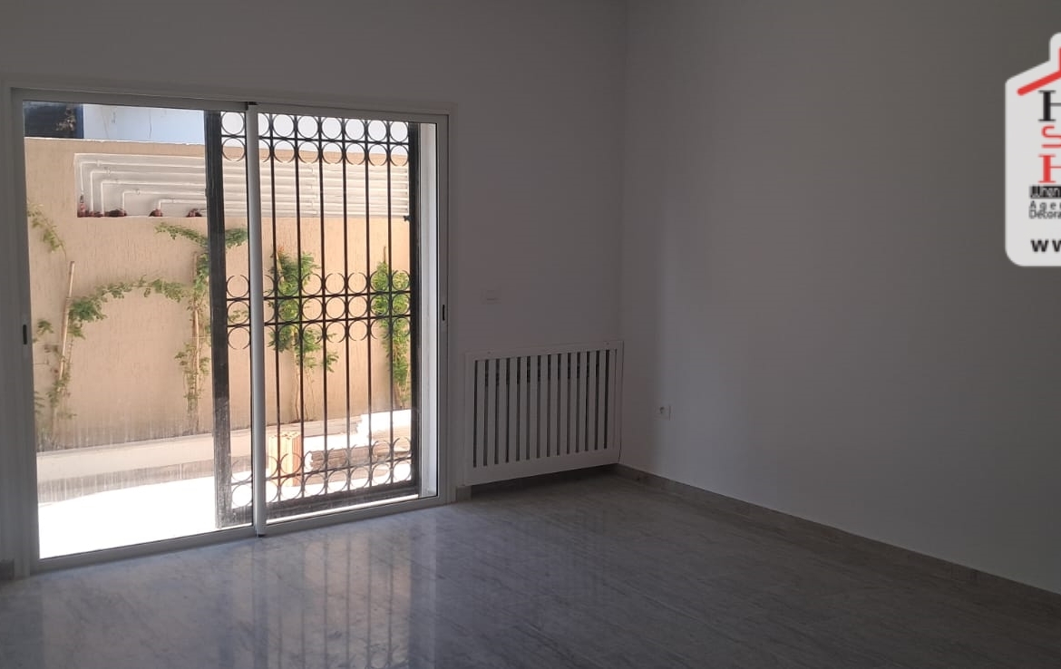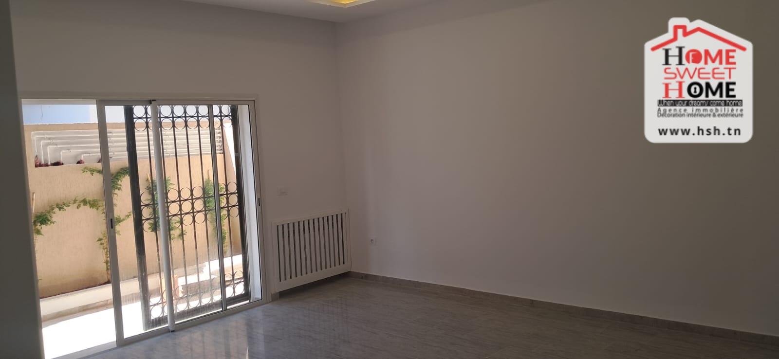 Un appart de haut standing jamais habité situé au RDC d’un immeuble à 50 m de la plage à Carthage Salambo. A L’entrée, On trouve un salon donnant sur une terrasse, une cuisine équipée avec séchoir, une salle d’eau pour les invités, 2 chambres et une salle de bain. NB: Le frais de syndic est inclus.