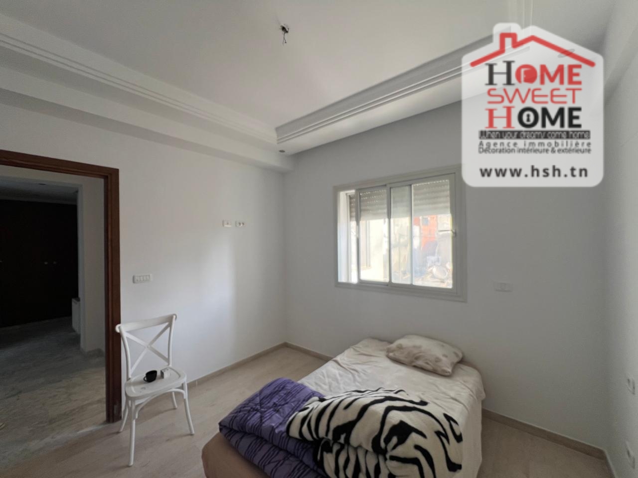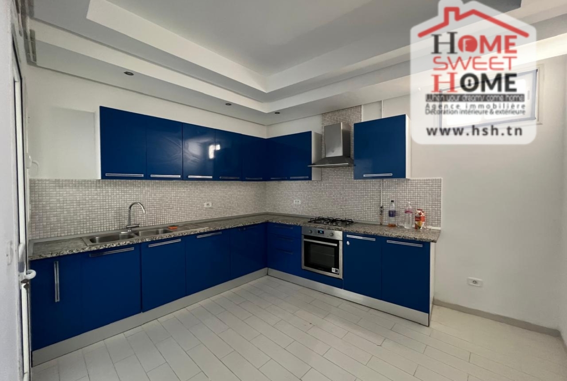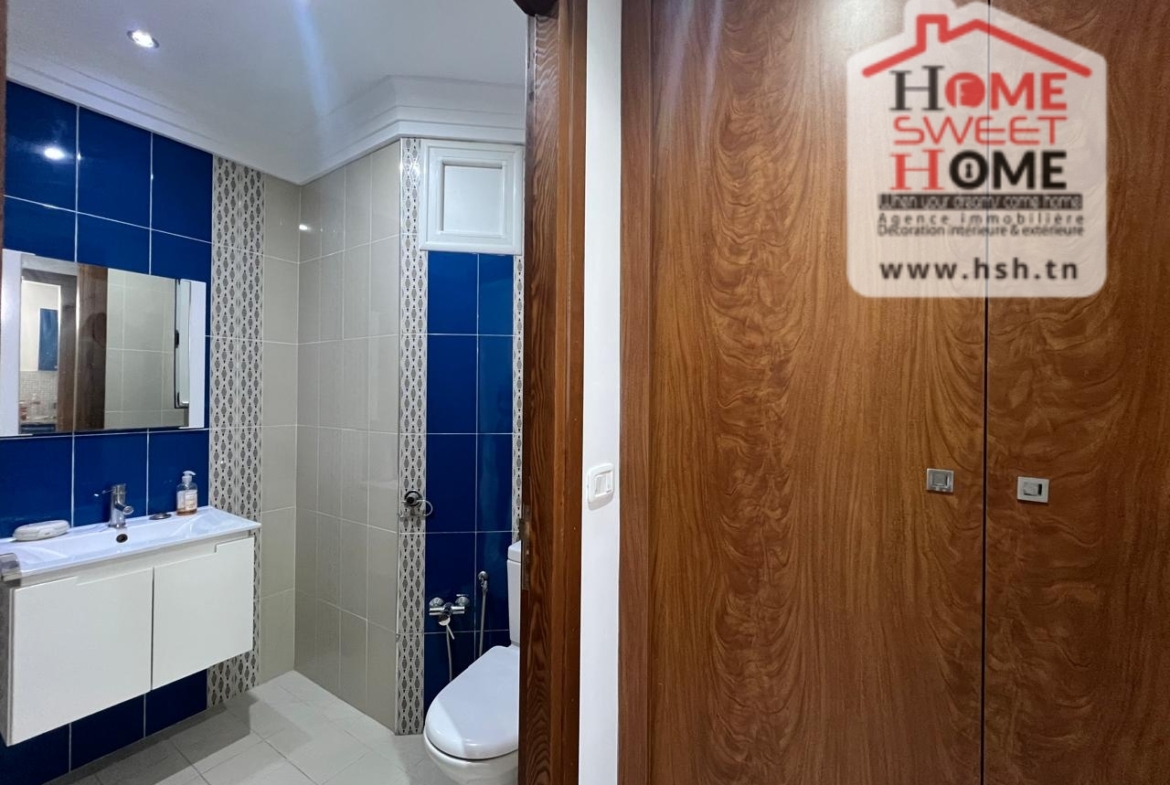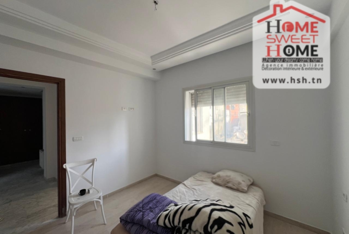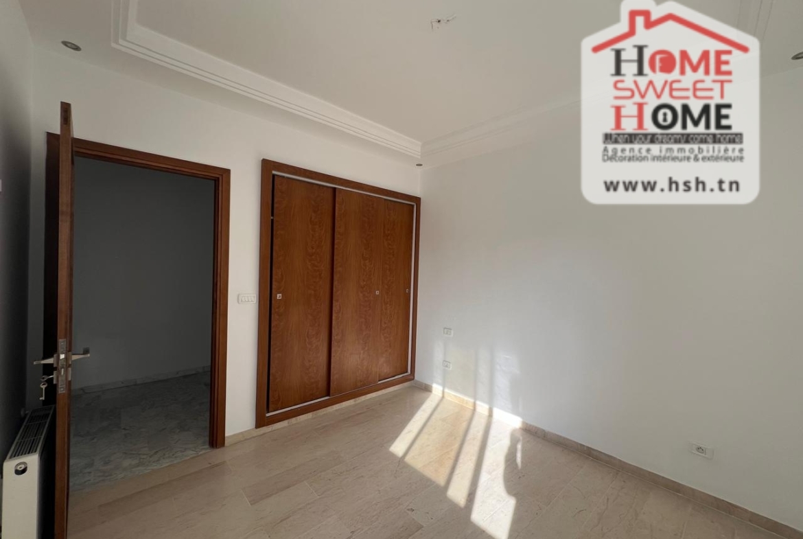 Un appartement S3 haut standing situé au 1er étage d’une résidence à Ain Zaghouan Sud. À l’entrée, on trouve un salon avec balcon, une cuisine équipée avec séchoir, une salle d’eau pour les invités, 3 chambres (dont une avec dressing) et une salle de bain. Une place de parking est également disponible au sous-sol.
