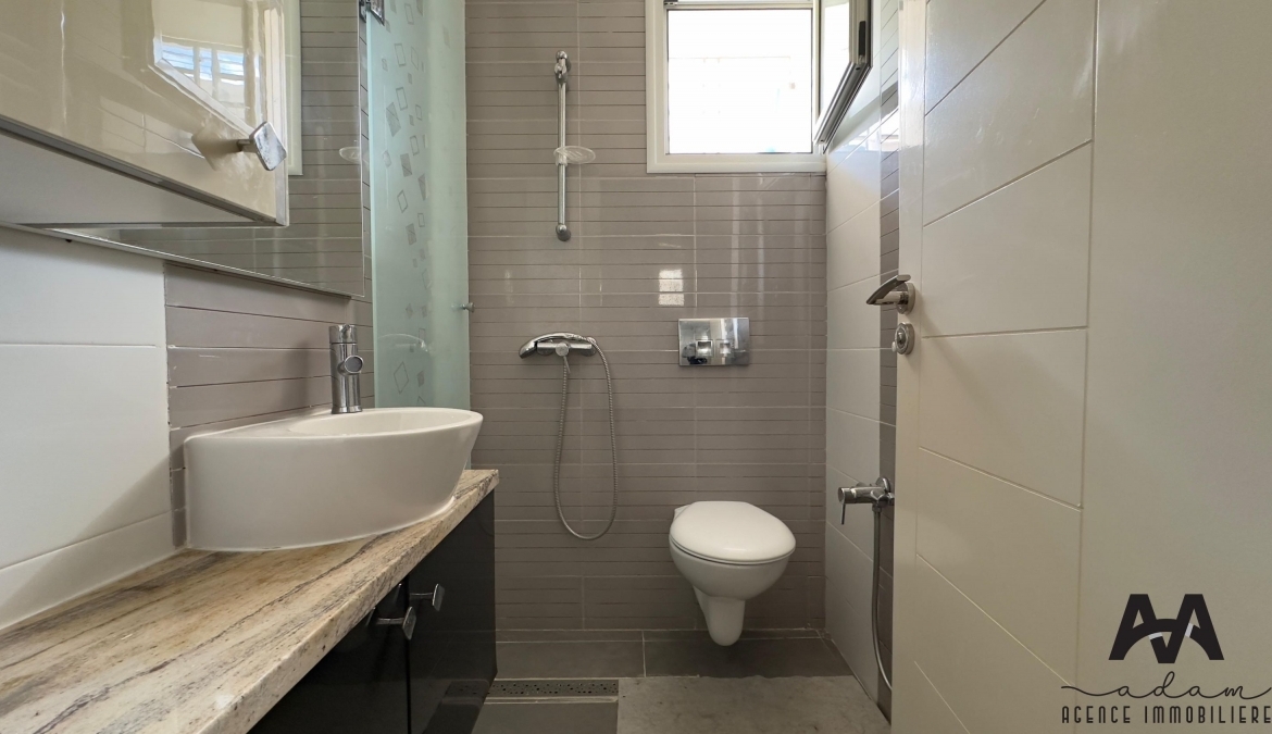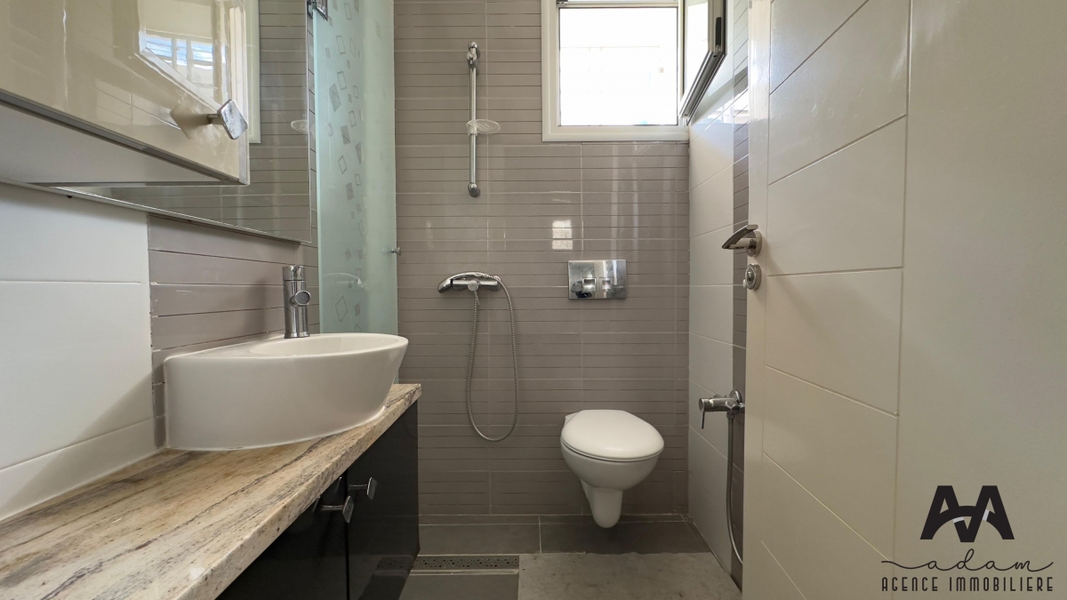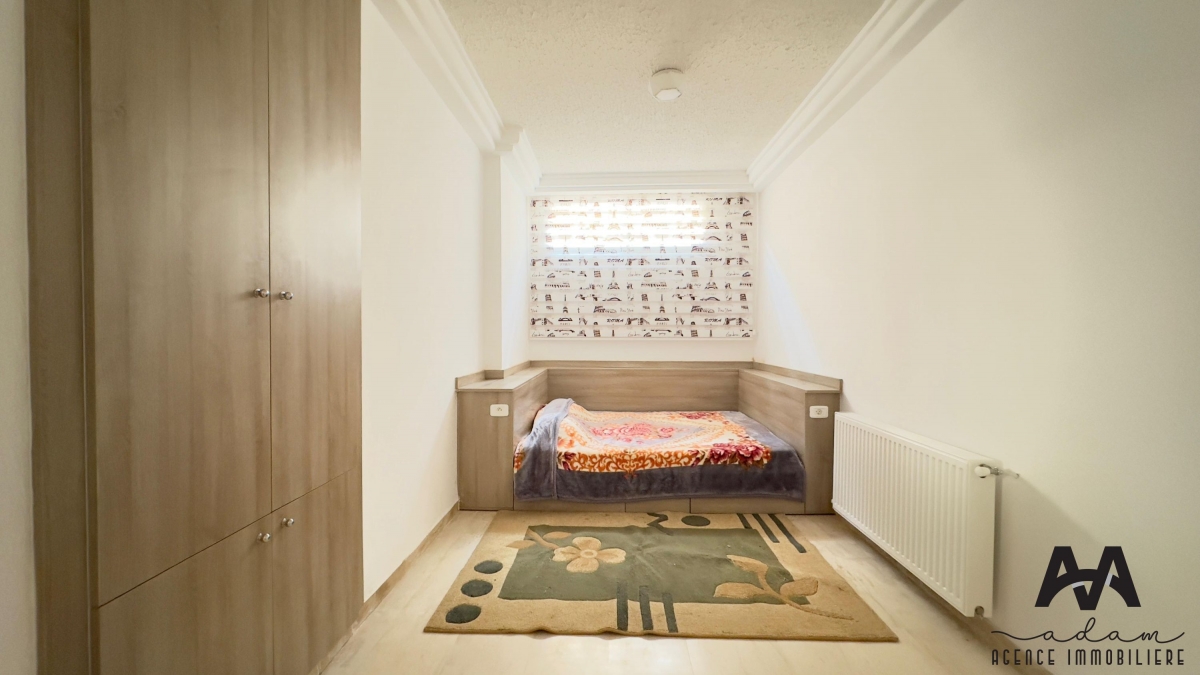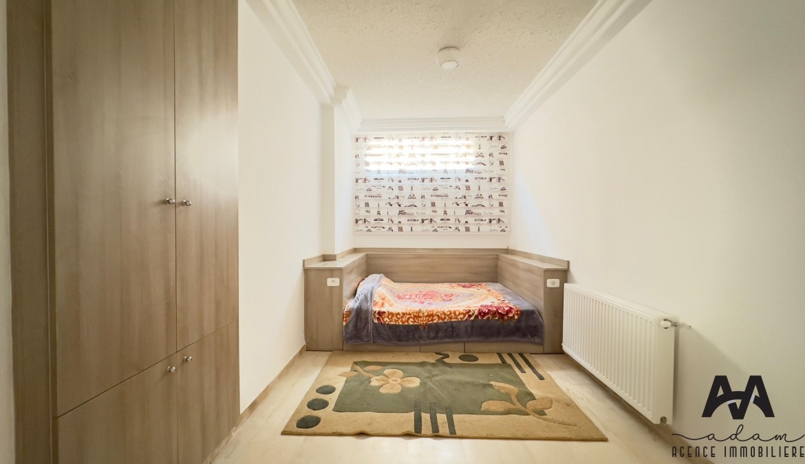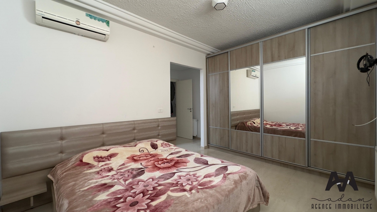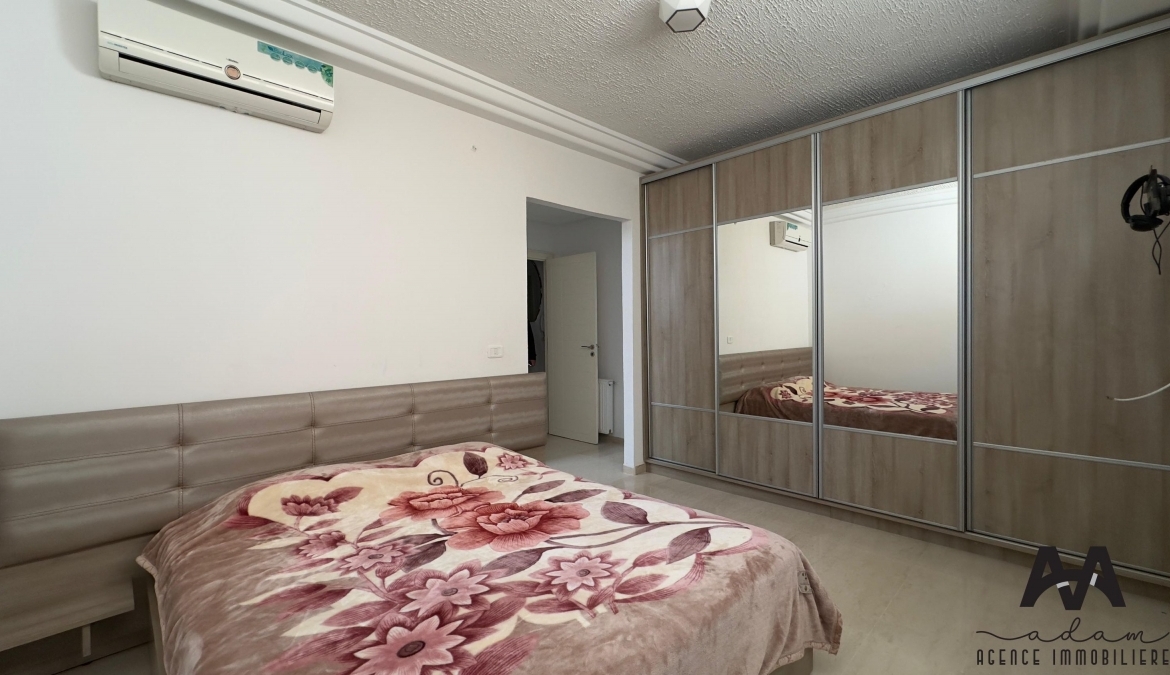 Un duplex S+2 meublé à AFH², Mrezga. Ce bien se compose de deux niveaux : au rez-de-chaussée, vous trouverez une cuisine indépendante aménagée et équipée (plaque, hotte, four, frigidaire), un salon spacieux ainsi qu’une salle d’eau avec douche à l’italienne. L’espace nuit est situé au sous-sol et comprend une suite parentale avec dressing et salle d’eau avec douche à l’italienne, ainsi qu’une chambre d’enfant avec dressing.