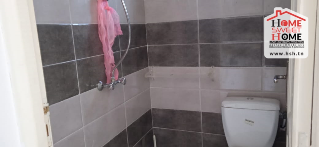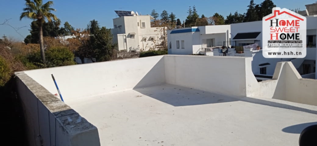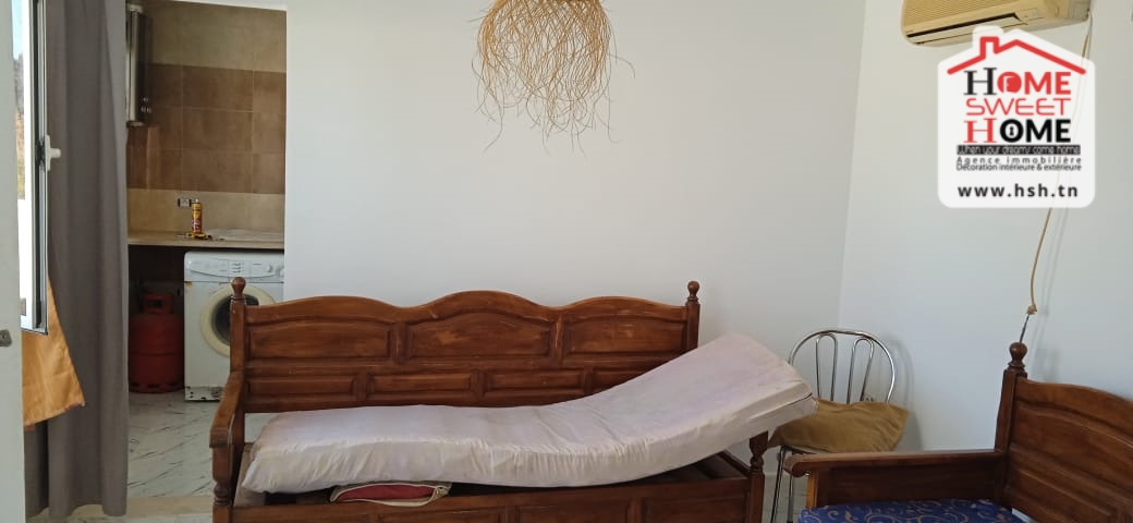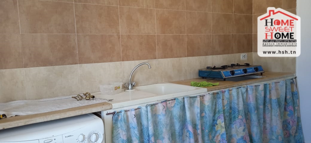 Un 1er étage de villa avec une entrée commune situé dans un quartier résidentiel côté mer à Carthage Salambo. On a un salon, une cuisine, une chambre, une salle de bain et une grande terrasse.