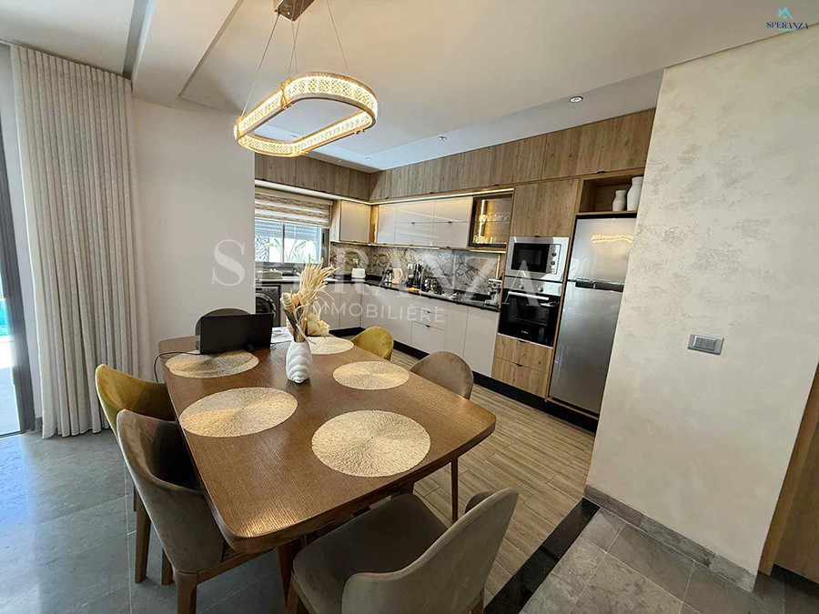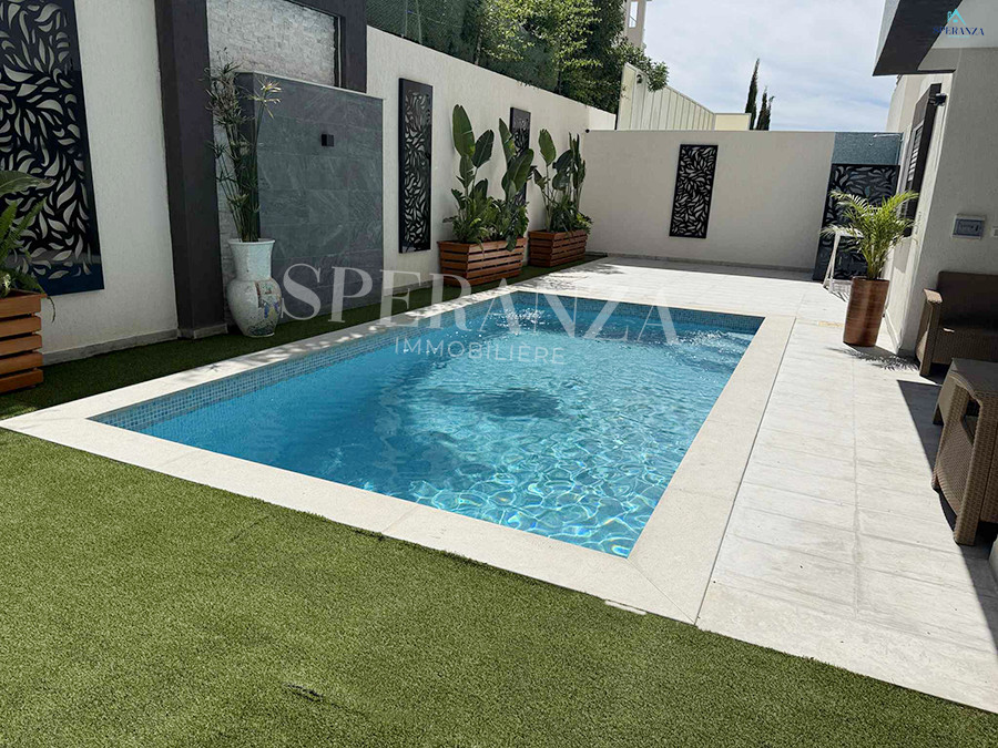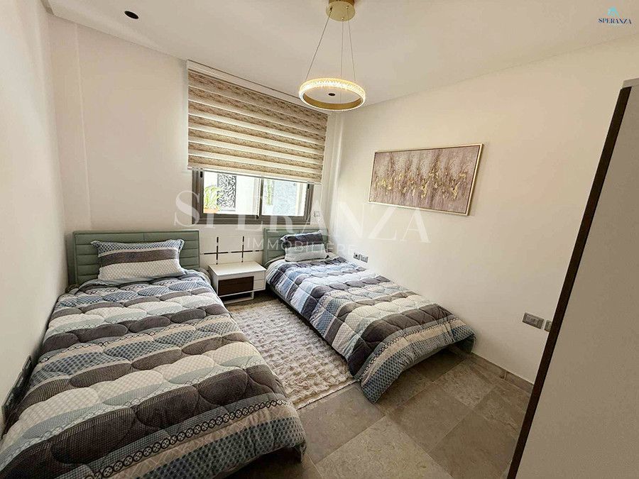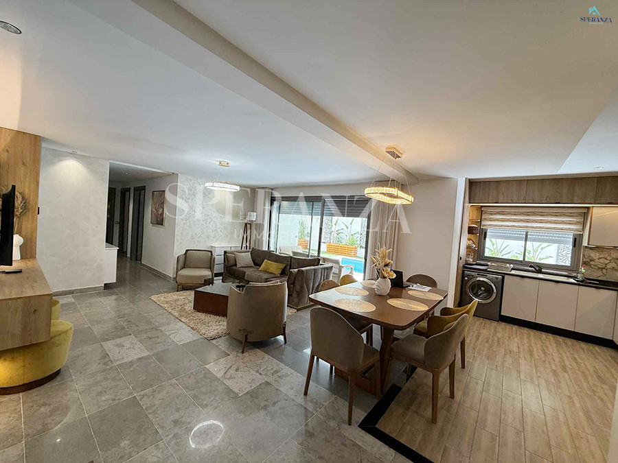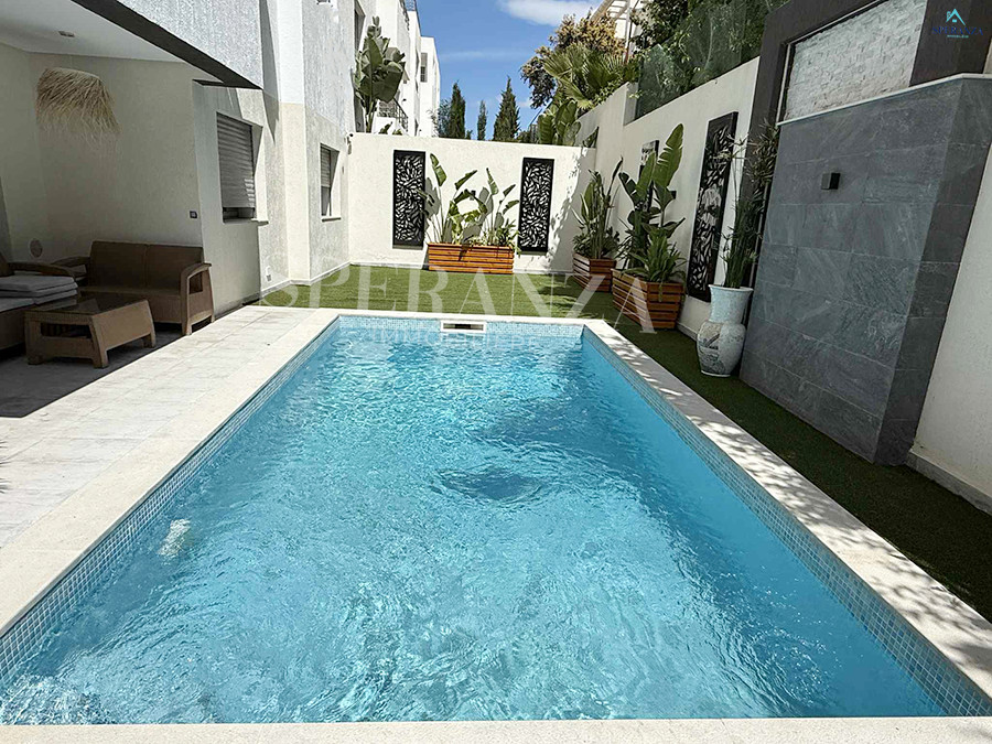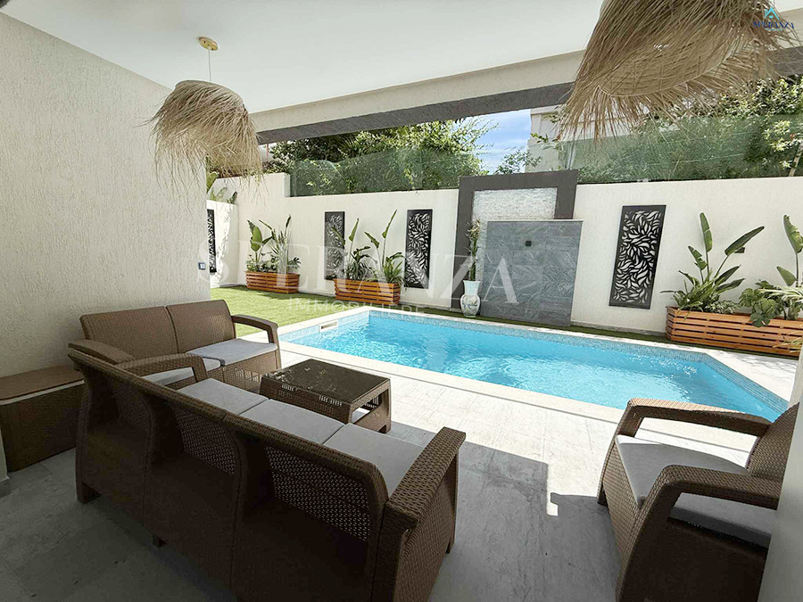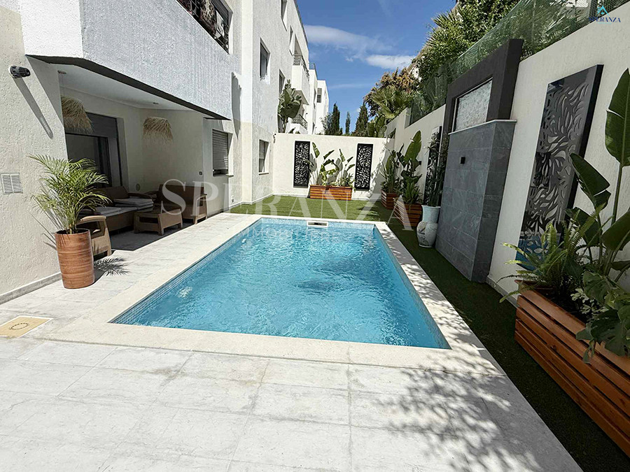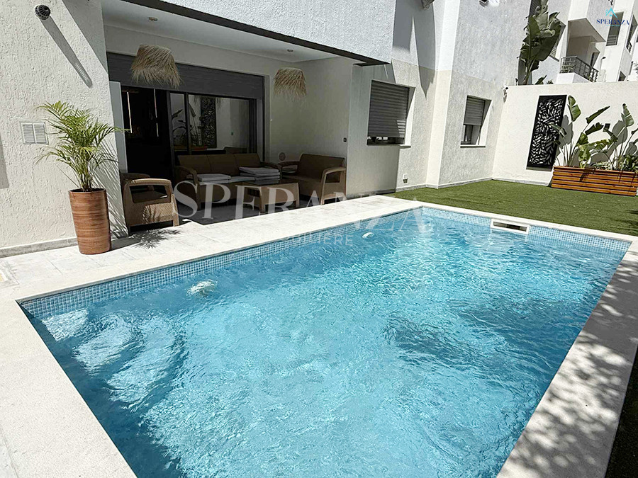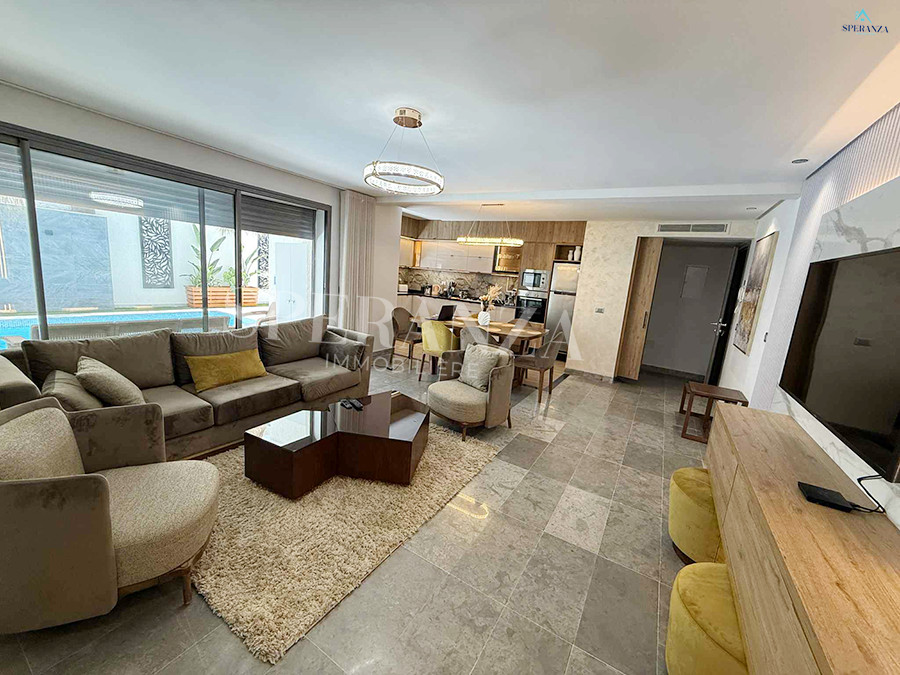 Speranza immobilière Hammamet vous propose à la location vavances Cet appartement RDC à Hammamet-nord . L’entrée donne sur un salon lumineux grâce à ses fenêtres qui possèdent un accès au terrasse , nous mène à la piscine. Une kitchenette est bien équipée par plusieurs éléments de rangement ,avec une salle d’eau pour les invités. Le compartiment nuit dispose deux  chambres à coucher et une salle d’eau. Ainsi qu’une place parking.