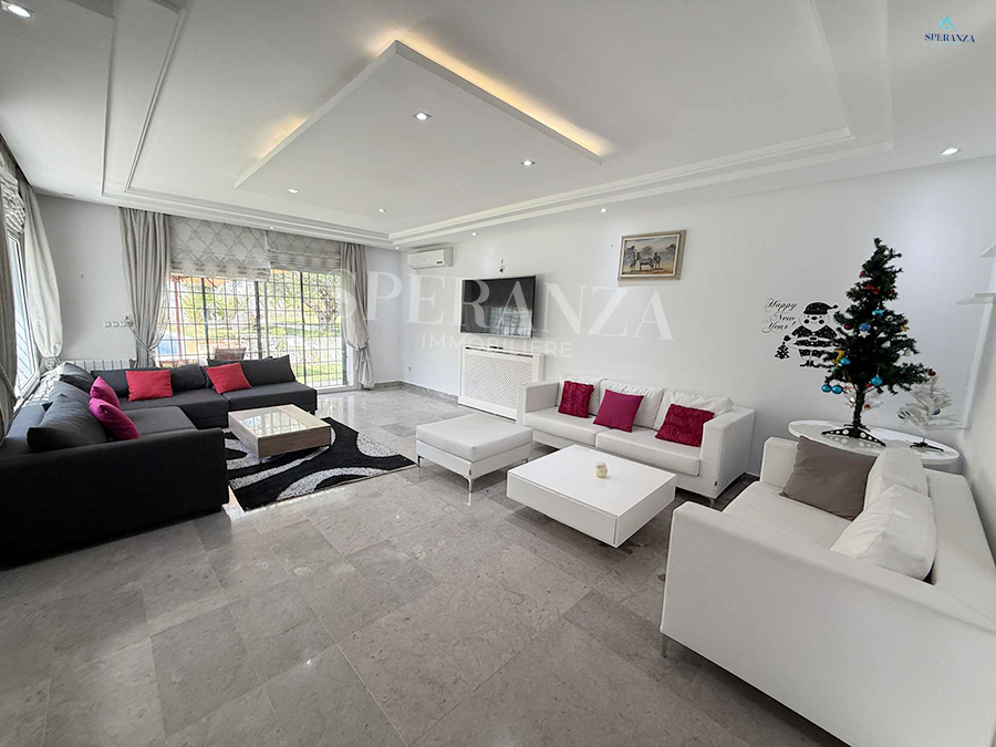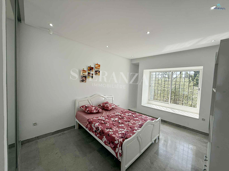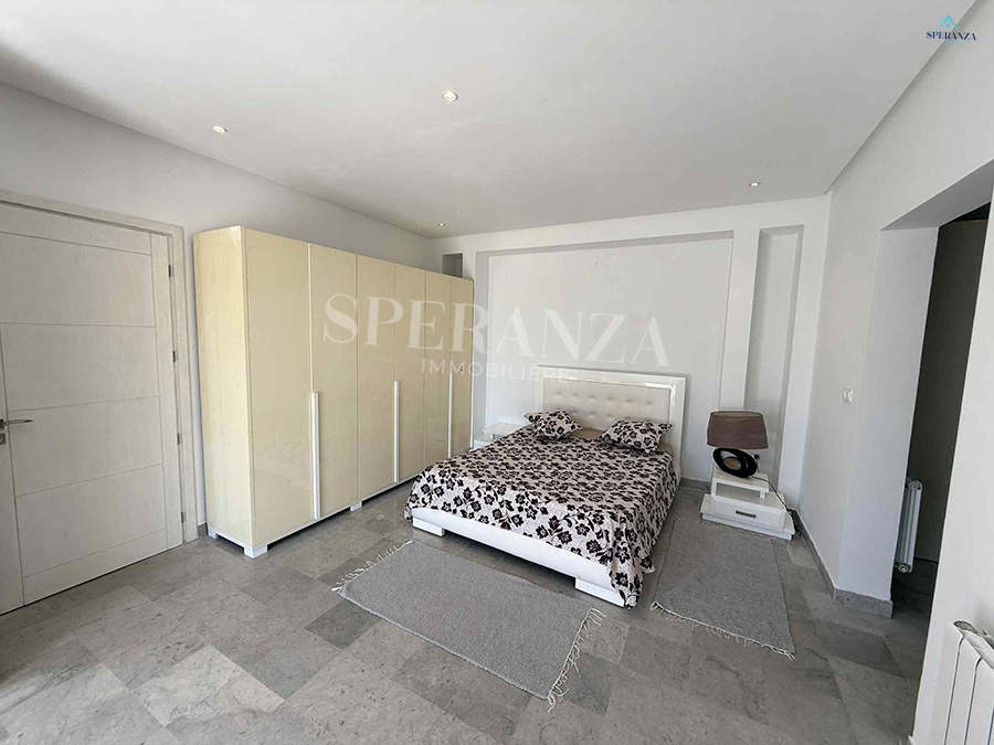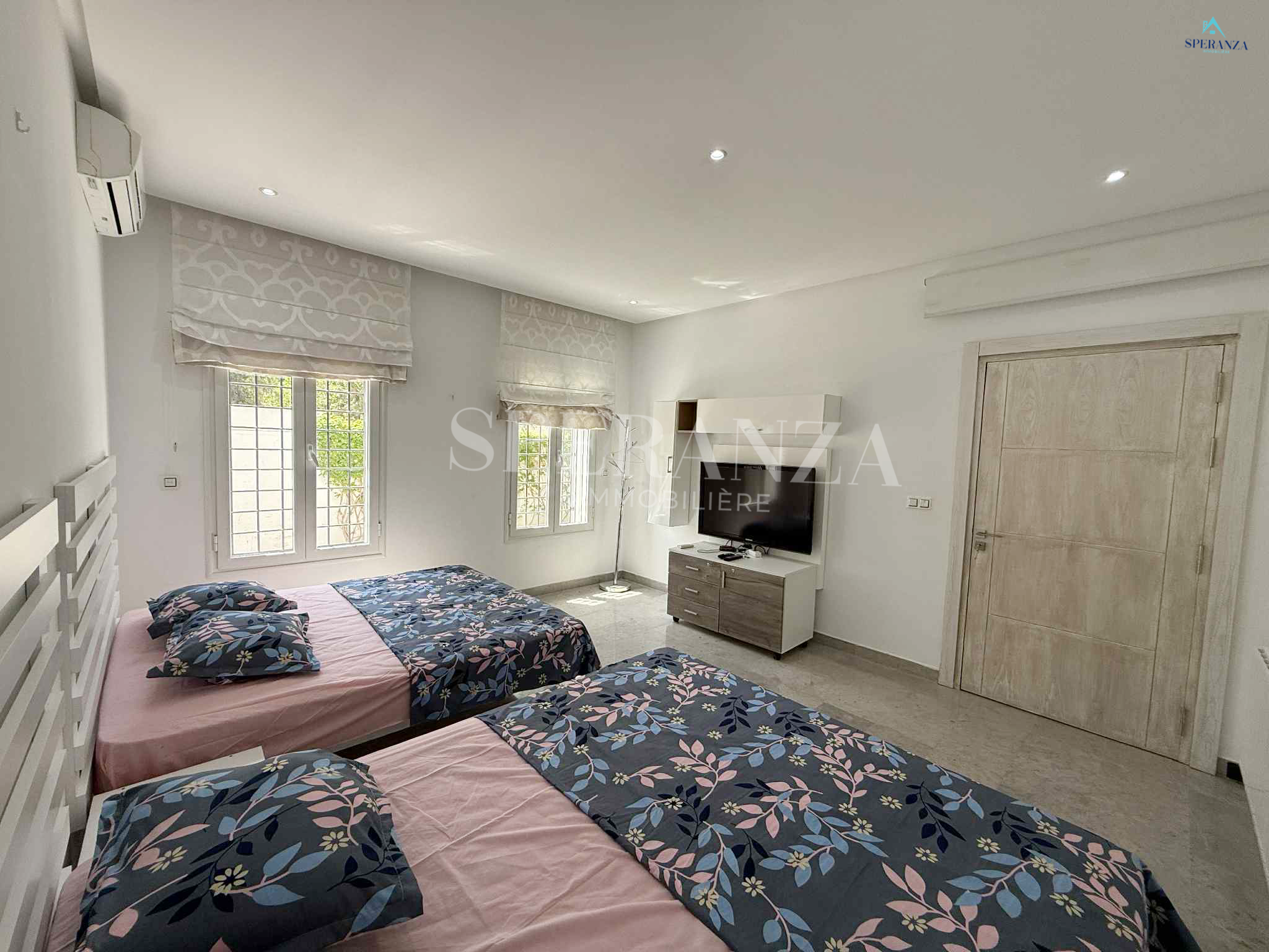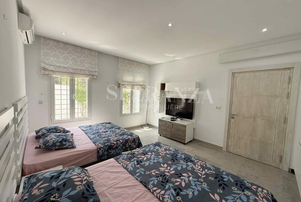 Speranza Immobilière Hammamet vous propose à la location annuelle cette villa située à Hammamet Nord. L’entrée principale s’ouvre sur un jardin spacieux avec piscine.L’espace de jour comprend un salon lumineux et spacieux, une cuisine entièrement aménagée avec tous les éléments de rangement nécessaires ainsi qu’une salle d’eau,une chambre a coucher .Un escalier mène au premier étage, qui se compose d’une suite parentale, d’une chambre a coucher, une terrasse avec vue sur la mer et un garage. NB : cette villa pour neuf mois