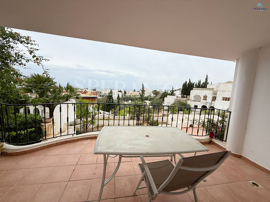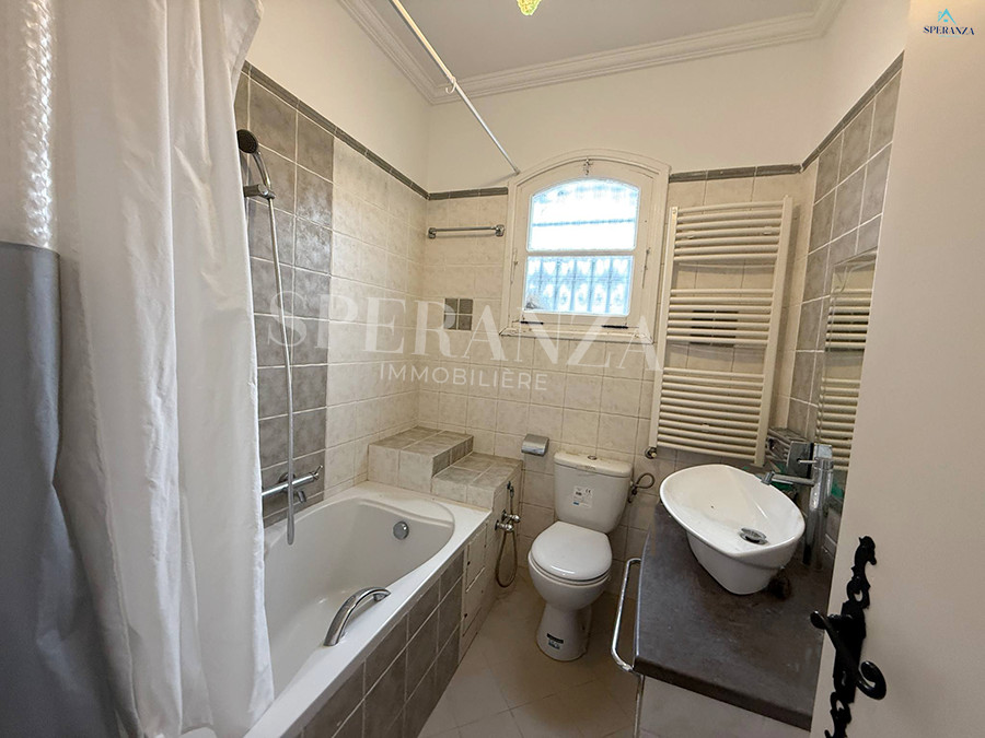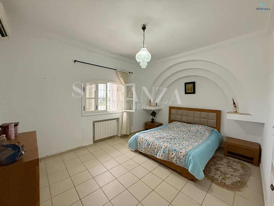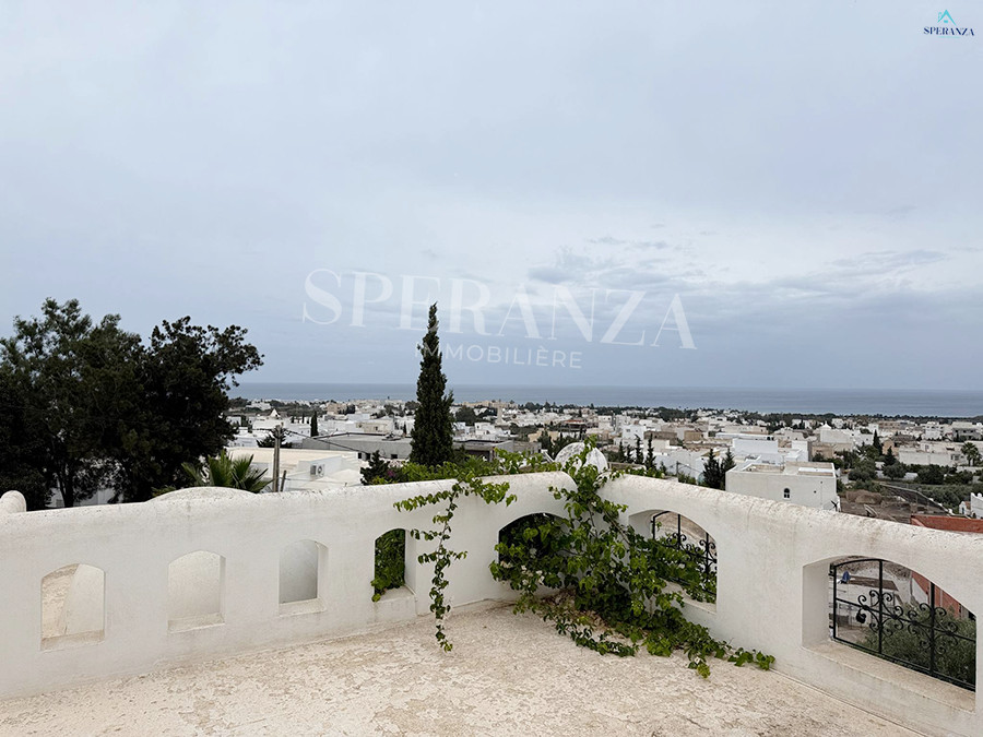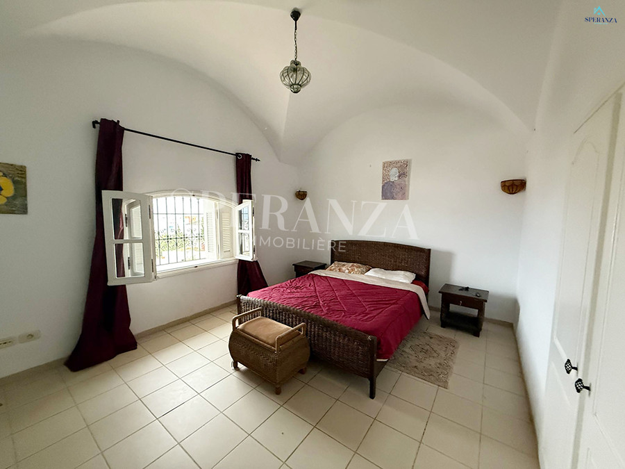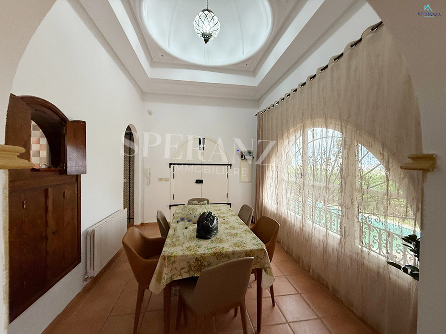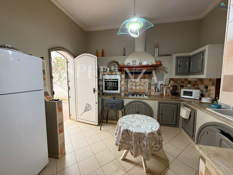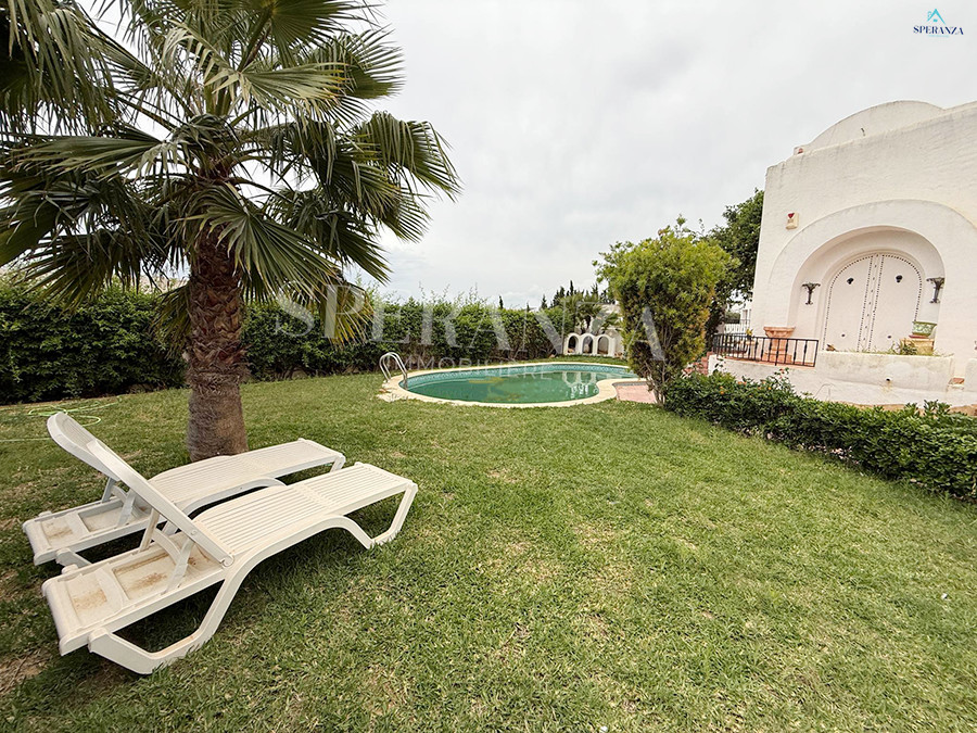 Speranza immobilière vous propose à la Location vacances Cette villa style moderne situé à Hammamet Nord. L’entrée principale bénéficie d’un jardin gazonné qui offre plusieurs espaces, un piscine.Au rez de chausser se trouve une salon lumineux, un séjour,une cuisine aménagée avec des espaces de rangement,une salle d’eau pour les invités. Un escalier nous mène vers 1 er étage qui se compose par  deux chambres à coucher ,un terrasse vue sur mer.