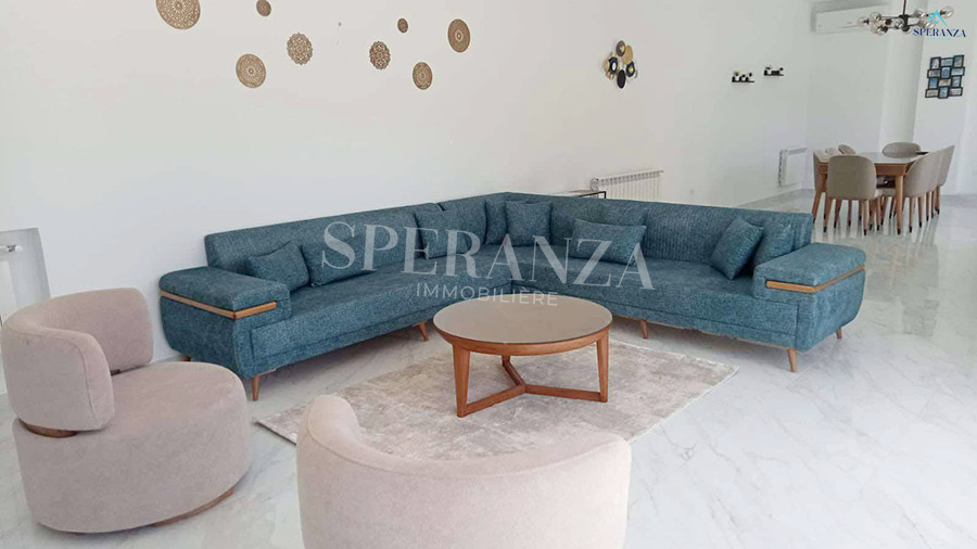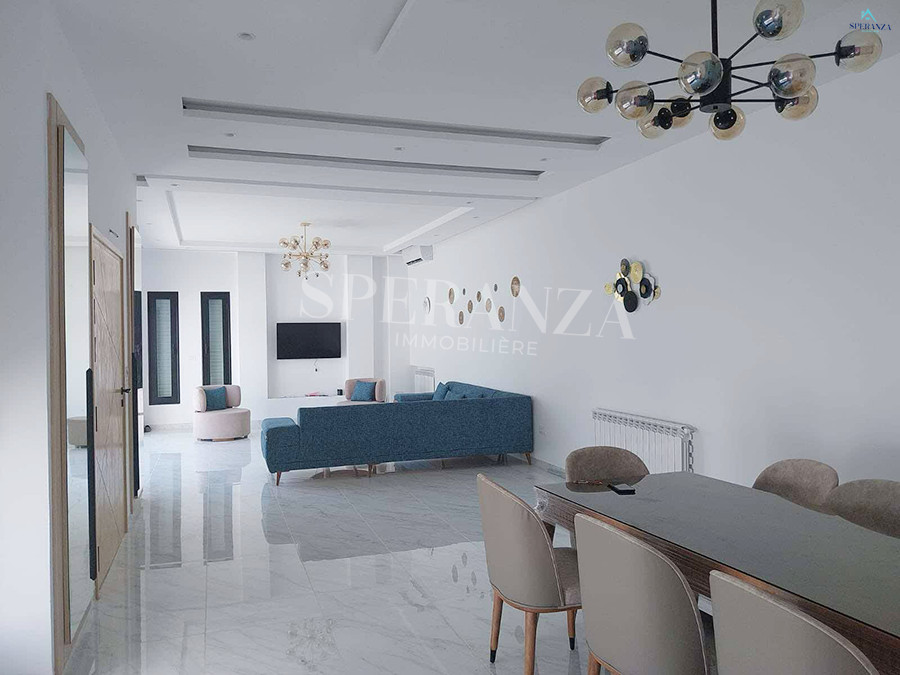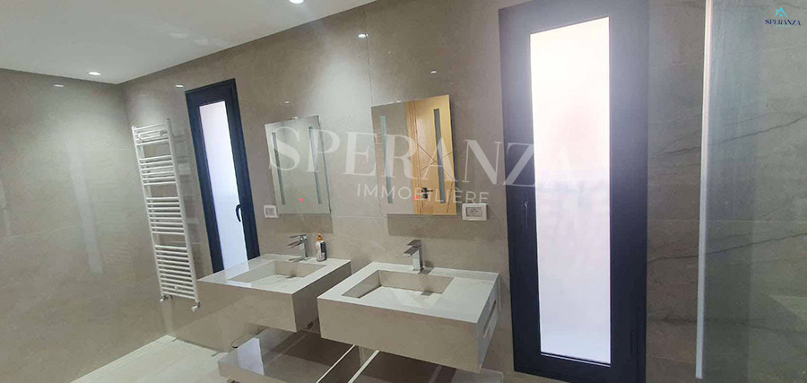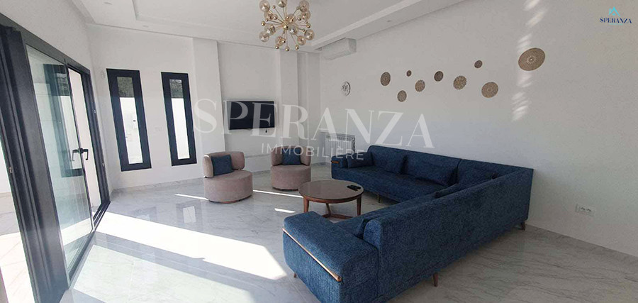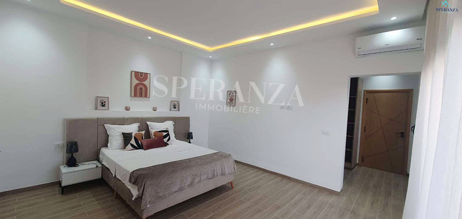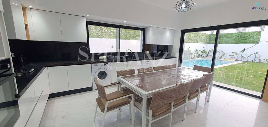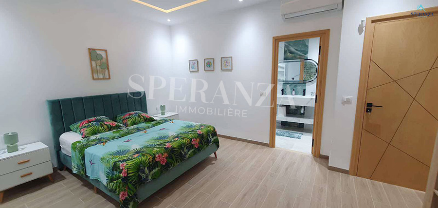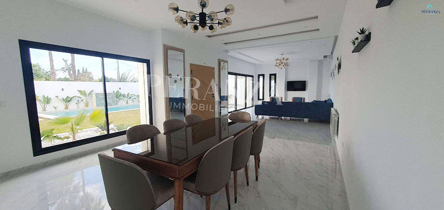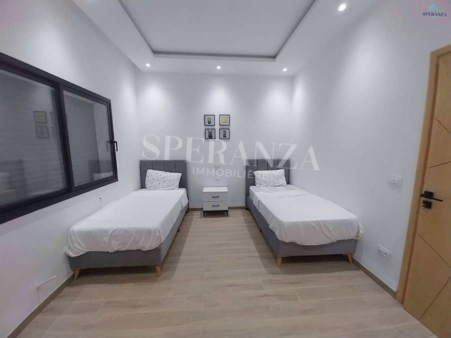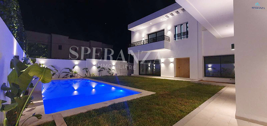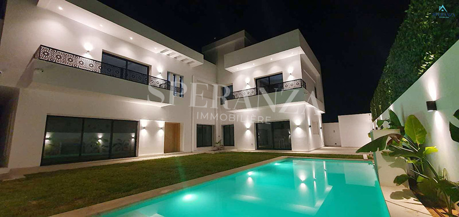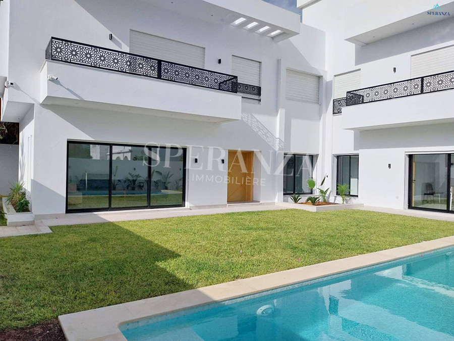 Speranza immobilière Hammamet vous propose à la location Vacances cette Villa qui situé à Hammamet centre proche de toutes commodités. Elle est bénéficiée d’un jardin gazonné avec piscine qui offre plusieurs espaces de détente.Le RDC est composée principalement d’un salon spacieux ,il donne sur la piscine avec salle à manger , une cuisine dispose plusieurs éléments de rangement ,une salle d’eau pour les invitées et une suite parentale. Le premier étage dispose quatre suites parentale. Ainsi qu’un terrasse.
