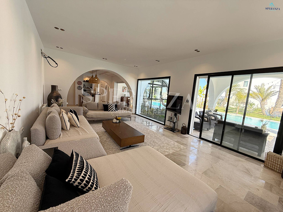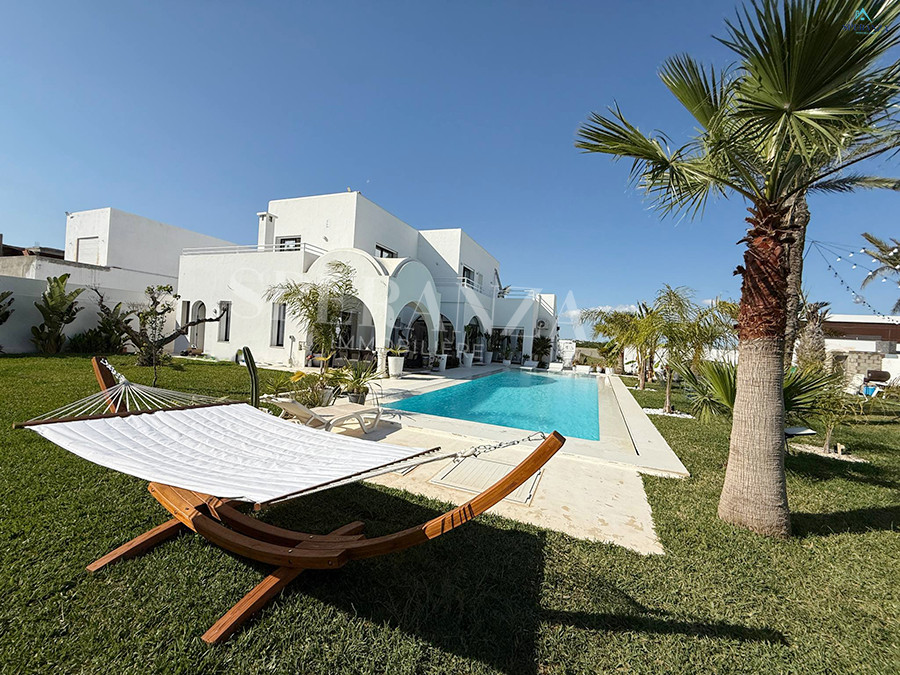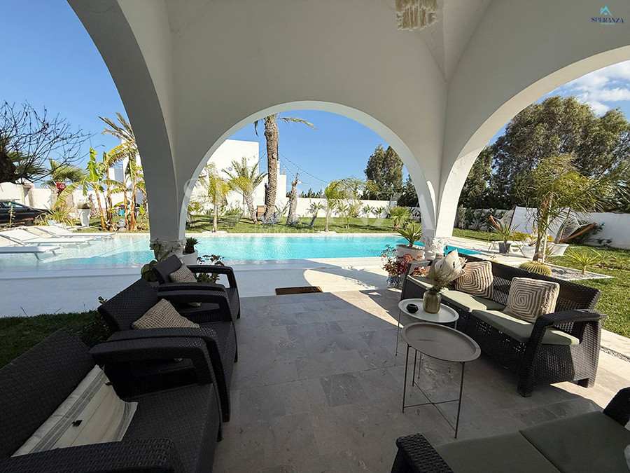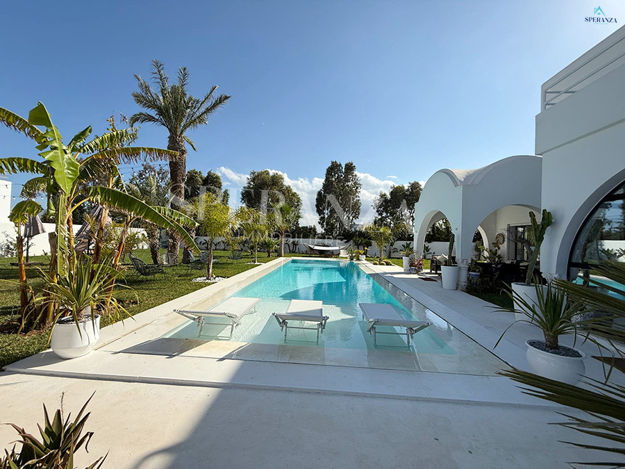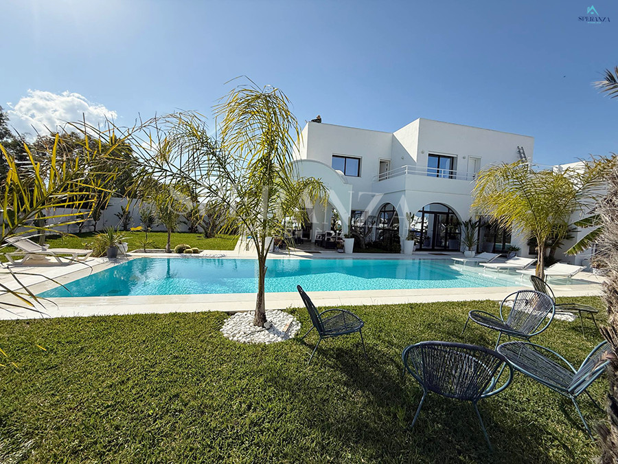 Speranza immobilière Hammamet vous propose à la location vacances cette Villa situé à Hammamet sud proche des commodités. Elle est bénéficiée d’un jardin gazonné avec piscine qui offre plusieurs espaces de détente. Le RDC est composée principalement d’un salon spacieux, une cuisine dispose de plusieurs éléments de rangements. Une salle d’eau pour les invités et une suite parentale. Un escalier nous mène au premier étage qui dispose deux chambres à coucher une salle d’eau, une suite parentale, ainsi q’un terrasse. Et une place parking.