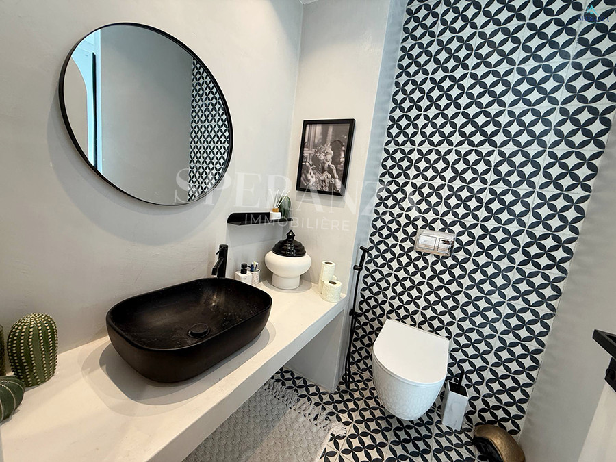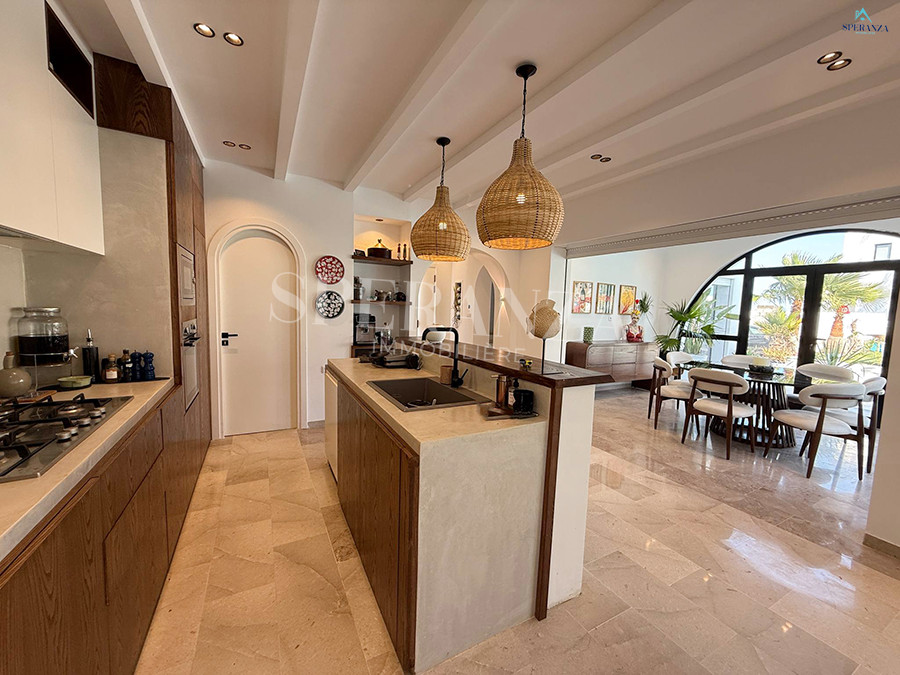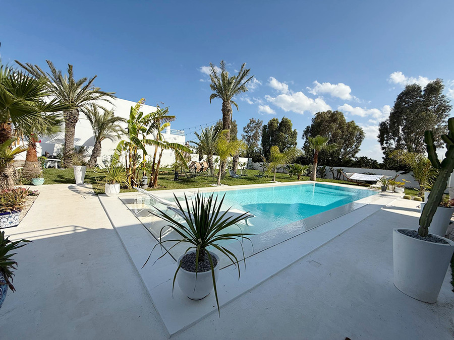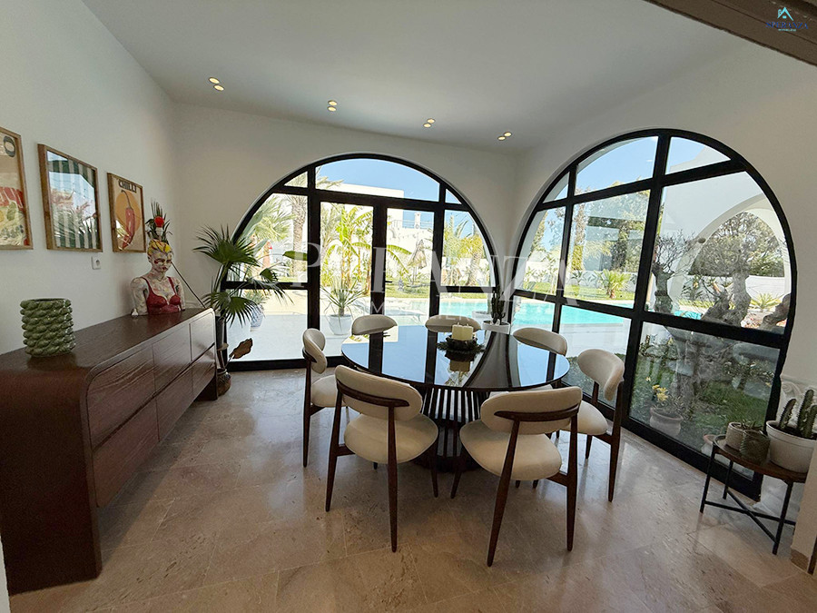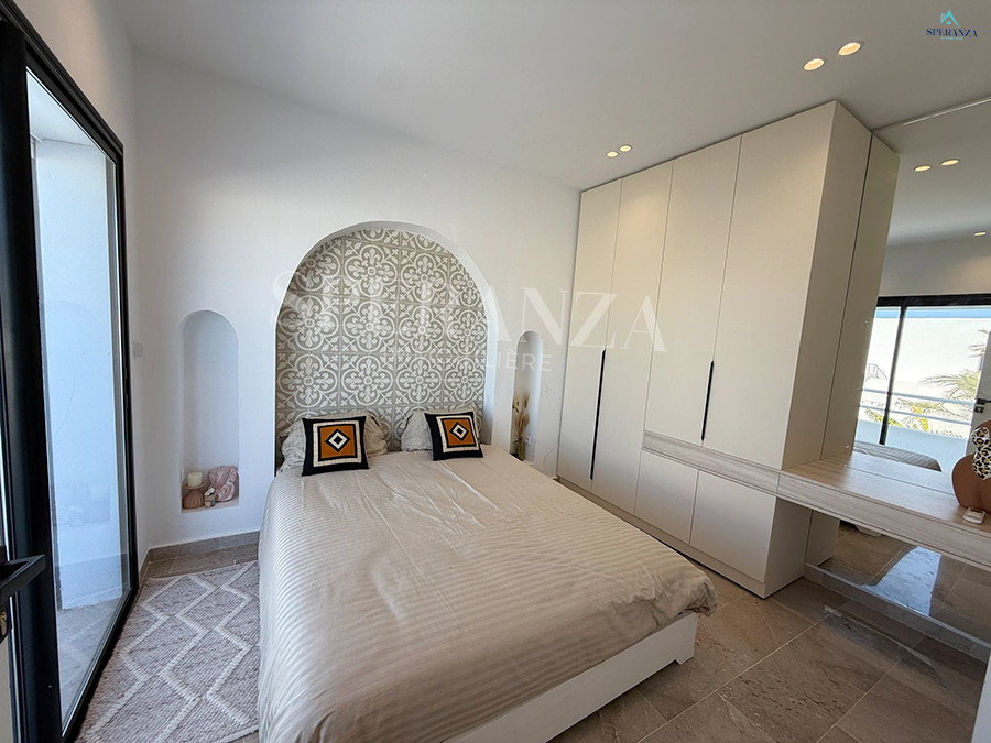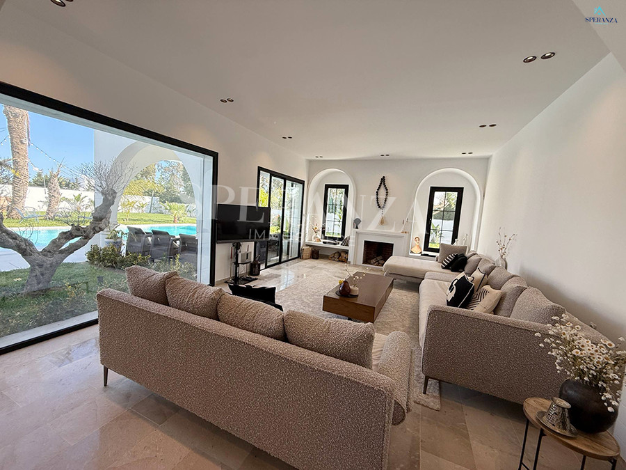 Speranza immobilière Hammamet vous propose à la location vacances cette Villa situé à Hammamet sud proche des commodités. Elle est bénéficiée d’un jardin gazonné avec piscine qui offre plusieurs espaces de détente. Le RDC est composée principalement d’un salon spacieux, une cuisine dispose de plusieurs éléments de rangements. Une salle d’eau pour les invités et une suite parentale. Un escalier nous mène au premier étage qui dispose deux chambres à coucher une salle d’eau, une suite parentale, ainsi q’un terrasse. Et une place parking.