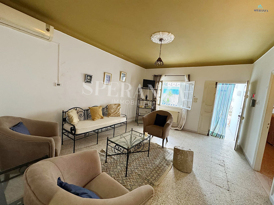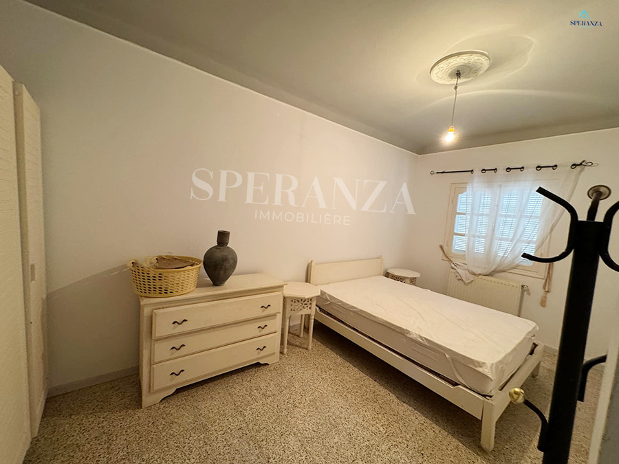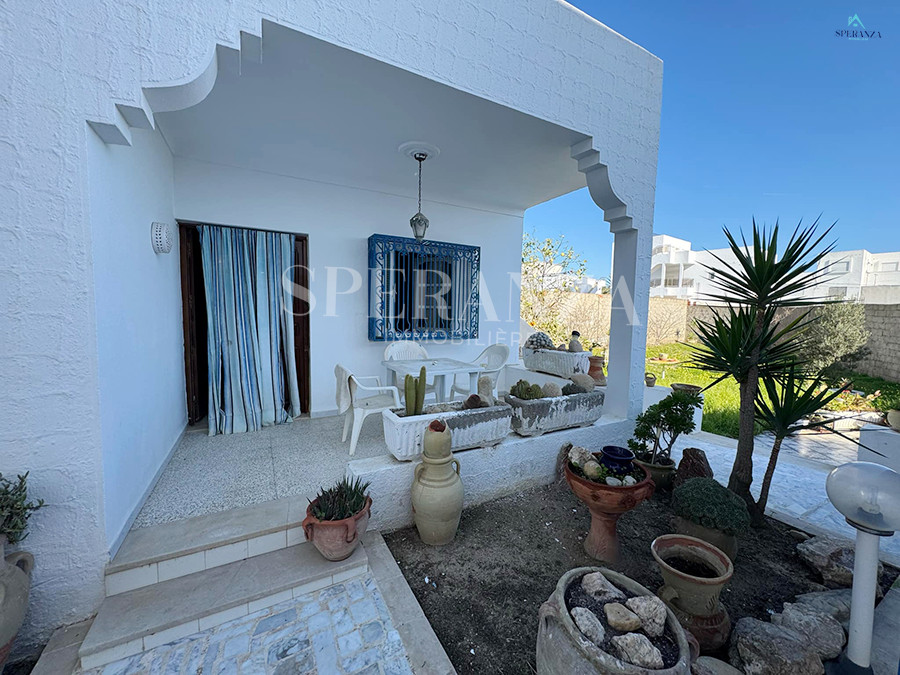 Speranza immobilière vous propose à la location annuelle Cette Maison RDC Meublé qui se situe à Hammamet ,il est proche de toutes les commodités .L’entrée principale donne sur un petit jardin, la partie jour est composée par un salon ,une cuisine bien équipée et aménagée par les éléments de rangement nécessaire, salle d’eau,la partie nuit se compose de deux chambre à coucher .Et un terrase avec un abri voiture.