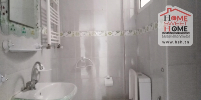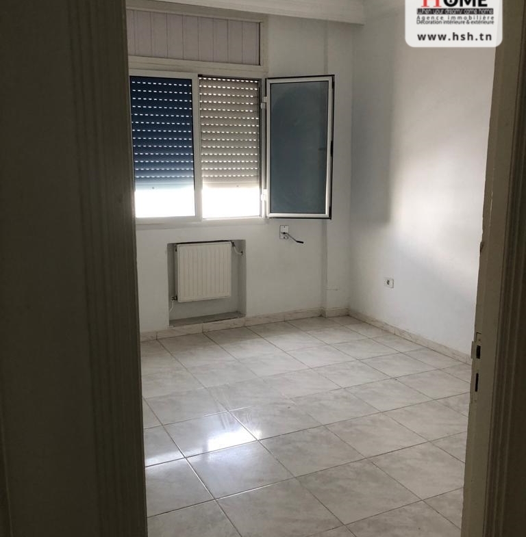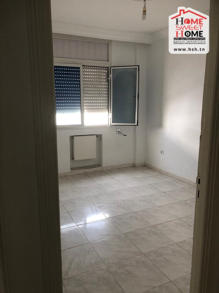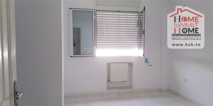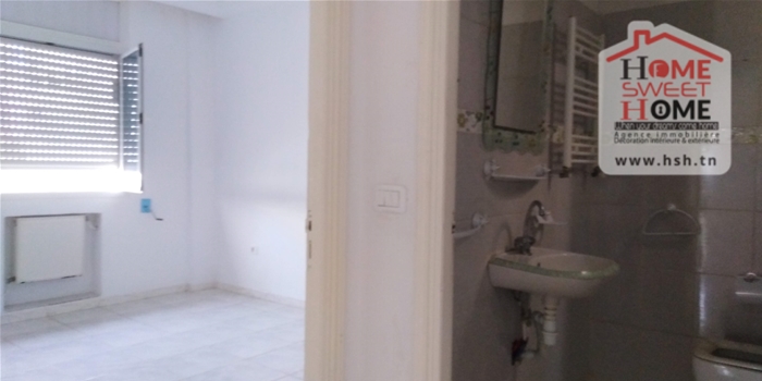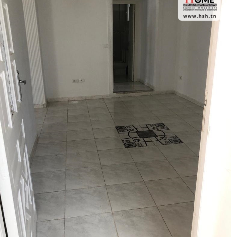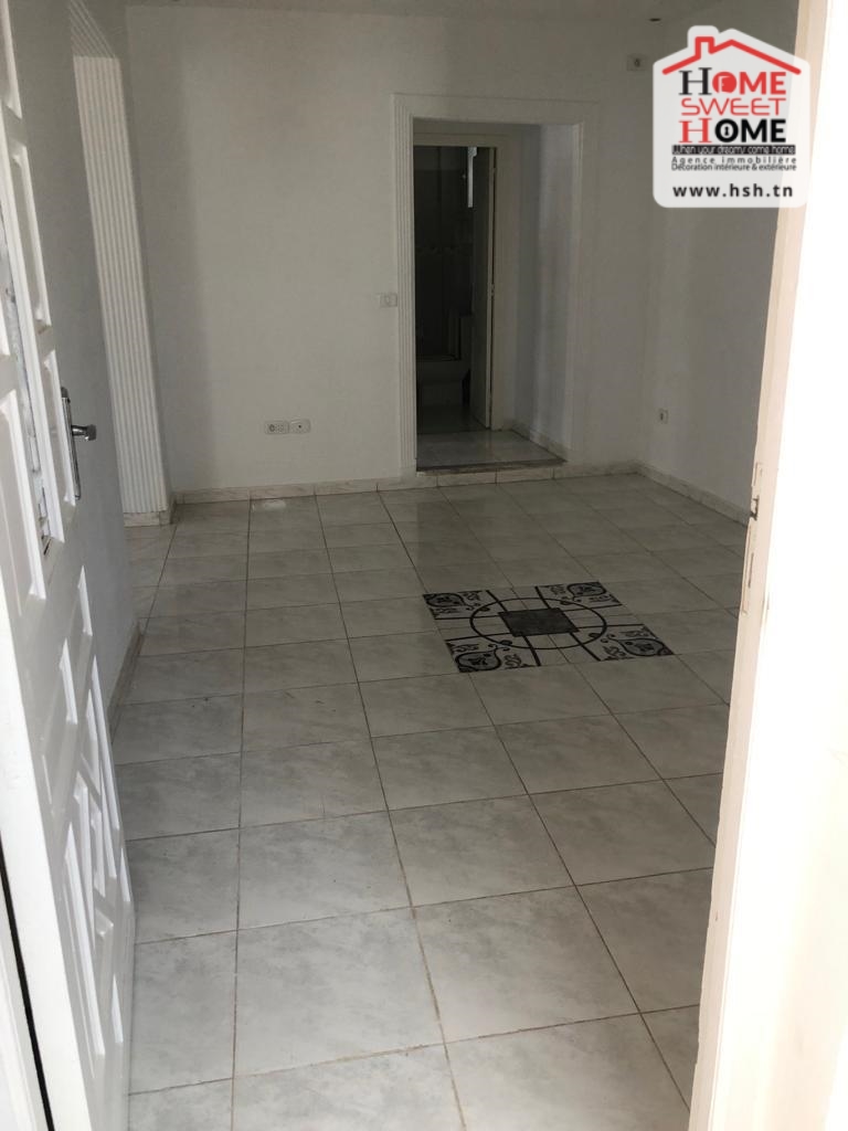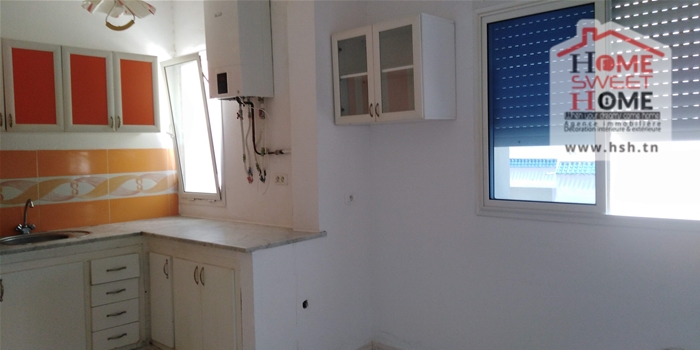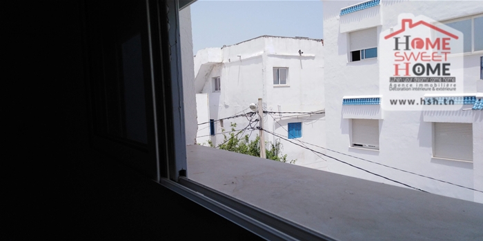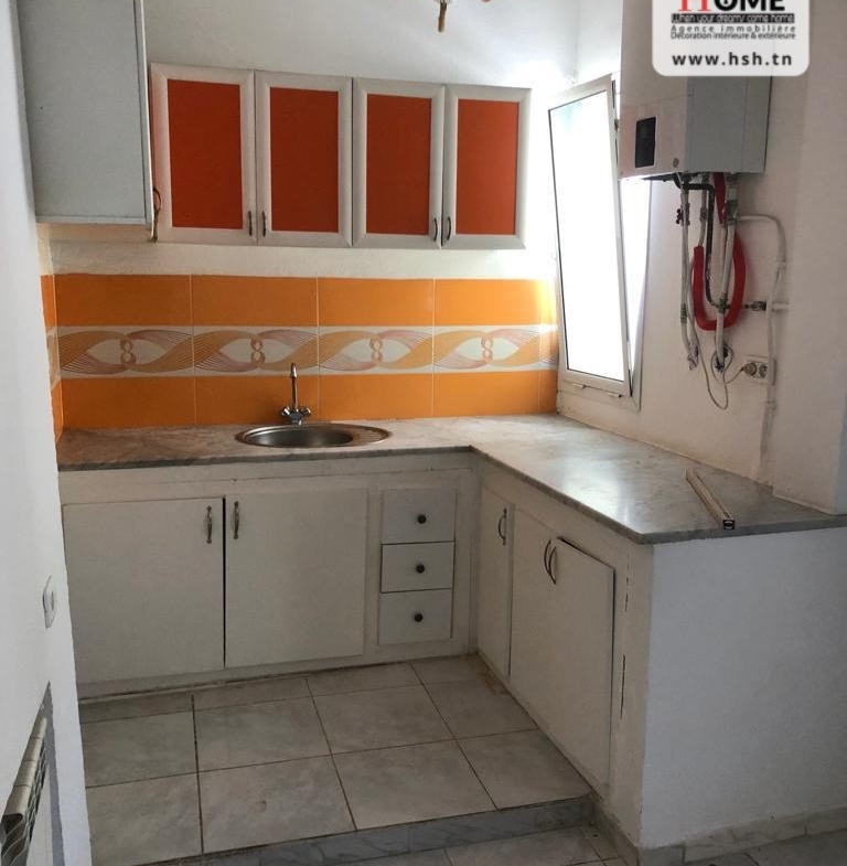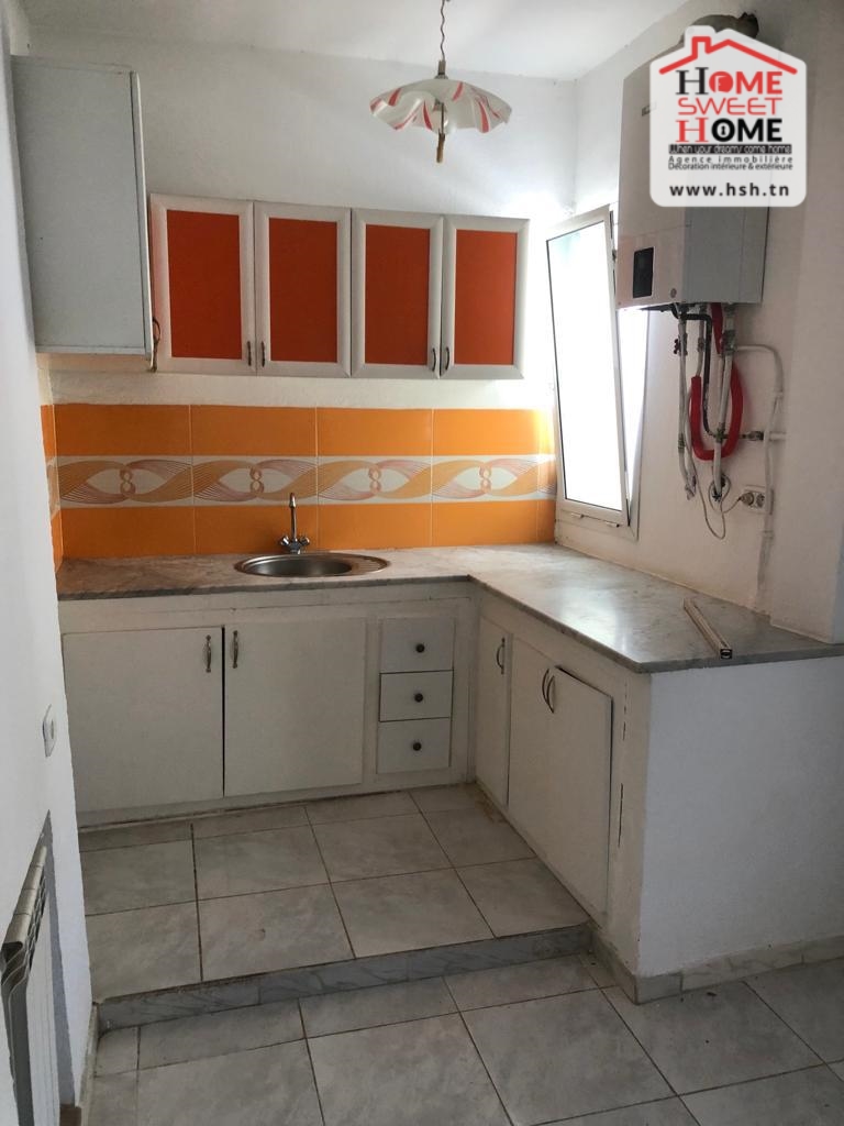 Un studio au 2éme étage pour la location annuelle situé dans un quartier calme à Bousalsla La Marsa avec une cuisine ouverte sur un salon , une salle à manger , une chambre et une salle de bain.
