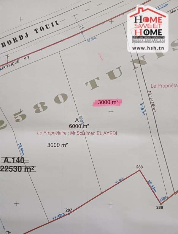 Un terrain promoteur d’une superficie de 3000 m² avec une façade de 39 m situé sur la route principale à Borj Touil, Ariana.