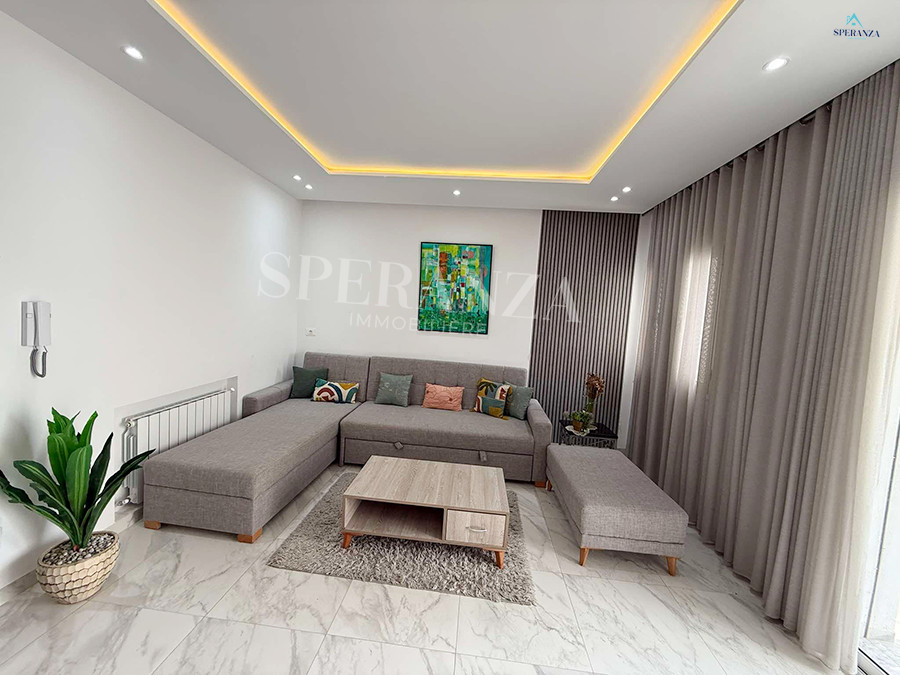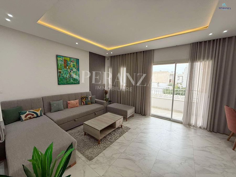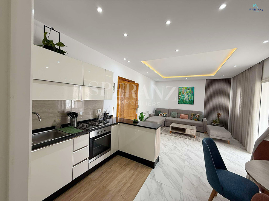Speranza immobilière Hammamet vous propose à la vente Cet appartement situé à Hammamet nord,au 1ér étage proche de toutes les commodités . La partie jours se compose par un salon lumineux avec terrasse,kitchenette aménagée avec des espaces de rangement, une salle d’eau . Le comportement nuit se compose par deux chambres à coucher.