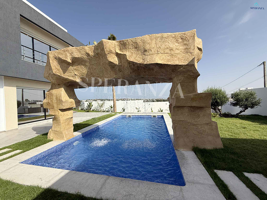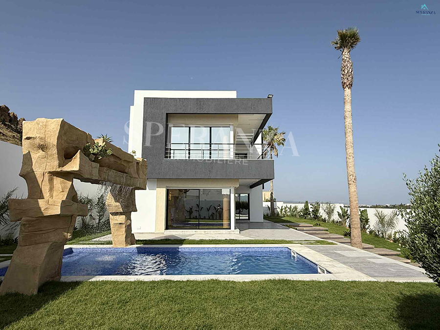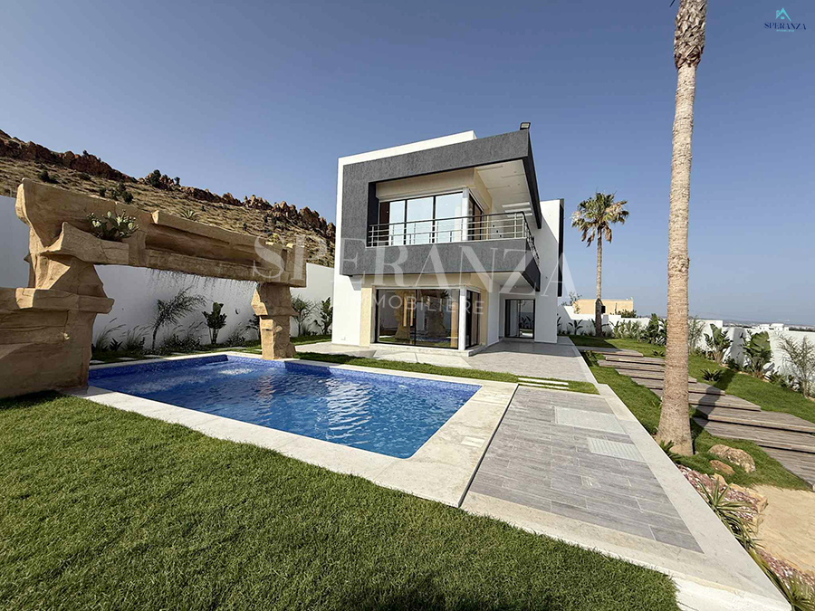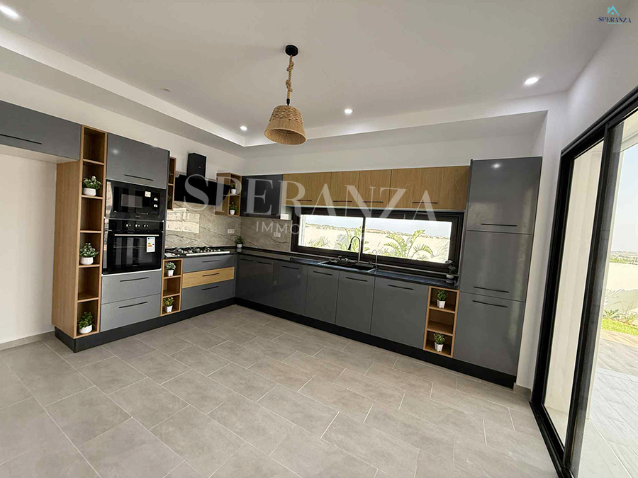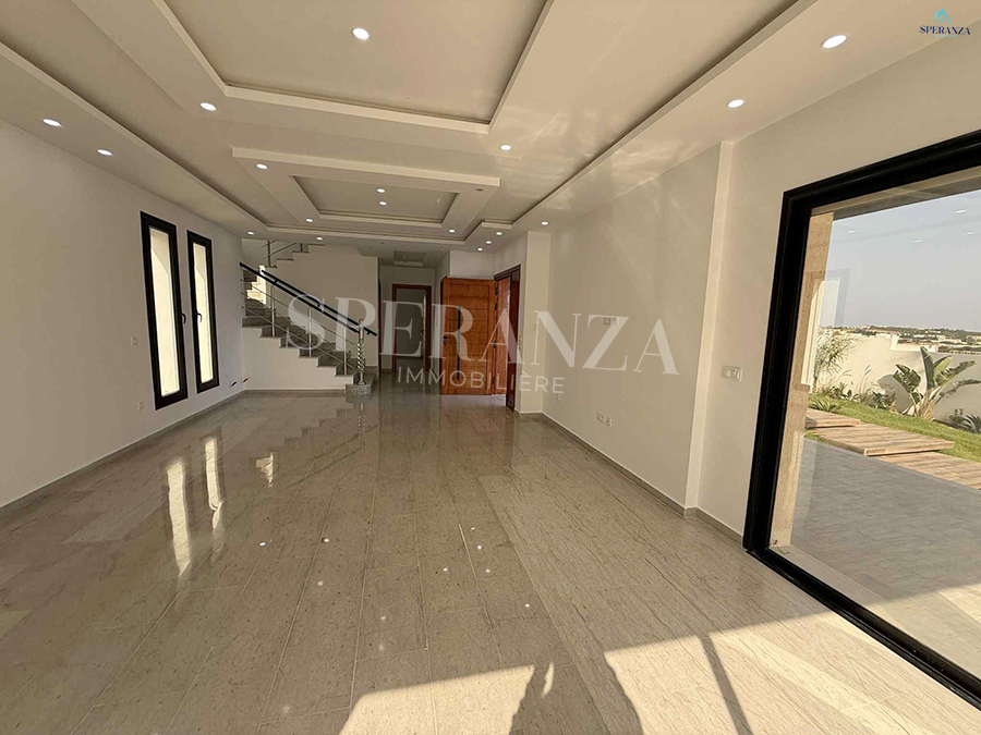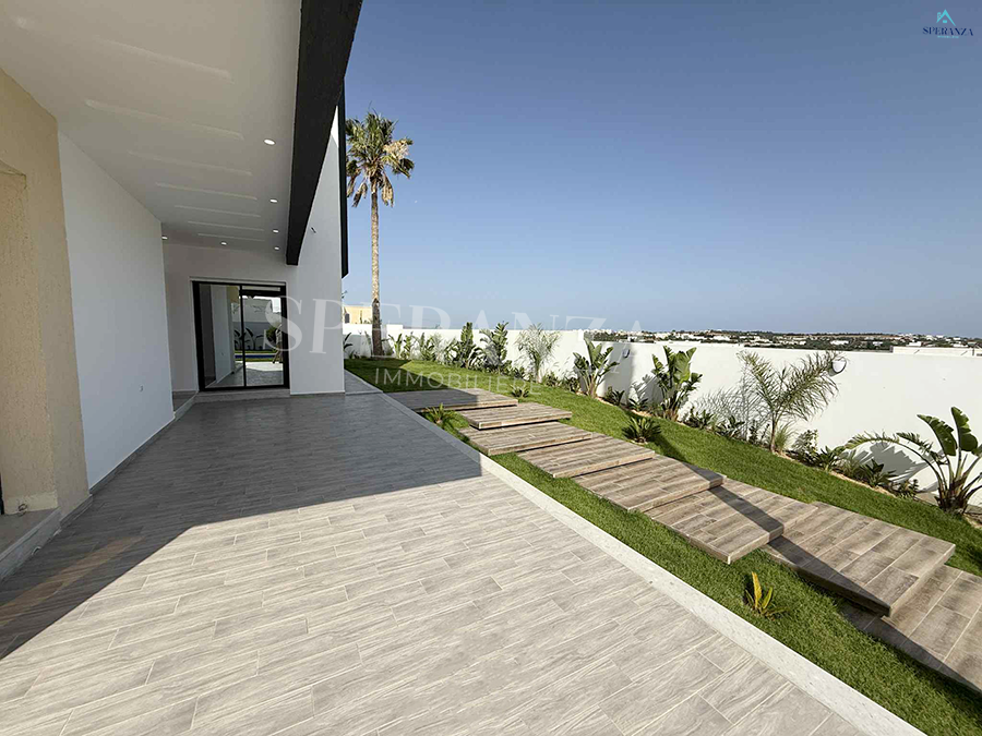 Speranza immobilière Hammamet vous propose à la vente cette villa situé à Hammamet Sud.L’entrée bénéficie d’un jardin gazonné avec un piscine.La partie jour est composée principalement d’un salon lumineux grâce à ses fenêtres qui offre une vue sur le jardin,une cuisine dispose de plusieurs éléments de rangement ,une suite parentale , une salle d’eau pour les invités. Un escalier nous mène au 1ér étage à la partie nuit qui se compose par une suite parentale et deux chambres à coucher et une salle d’eau. Ainsi qu’un terrasse.Quant à le deuxièmme étage disposoe d’un terrasse.