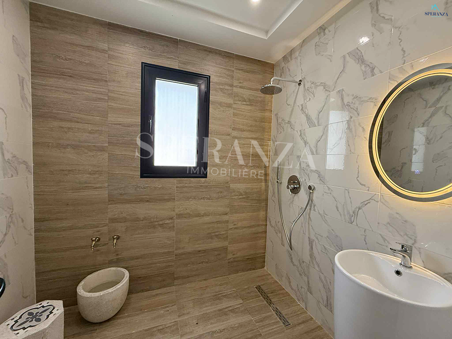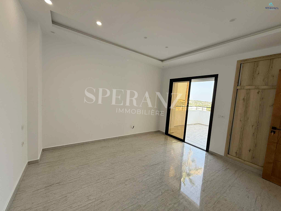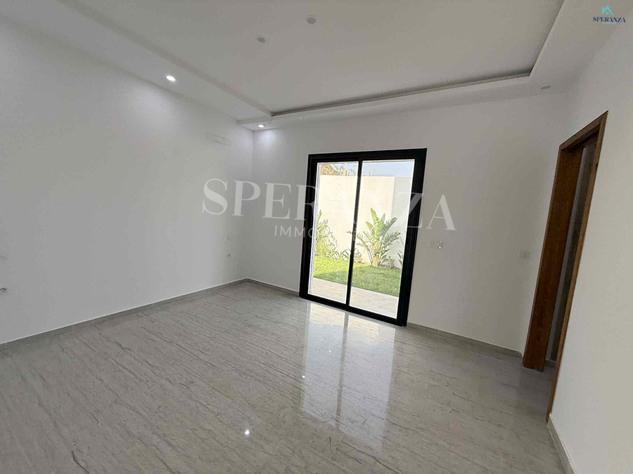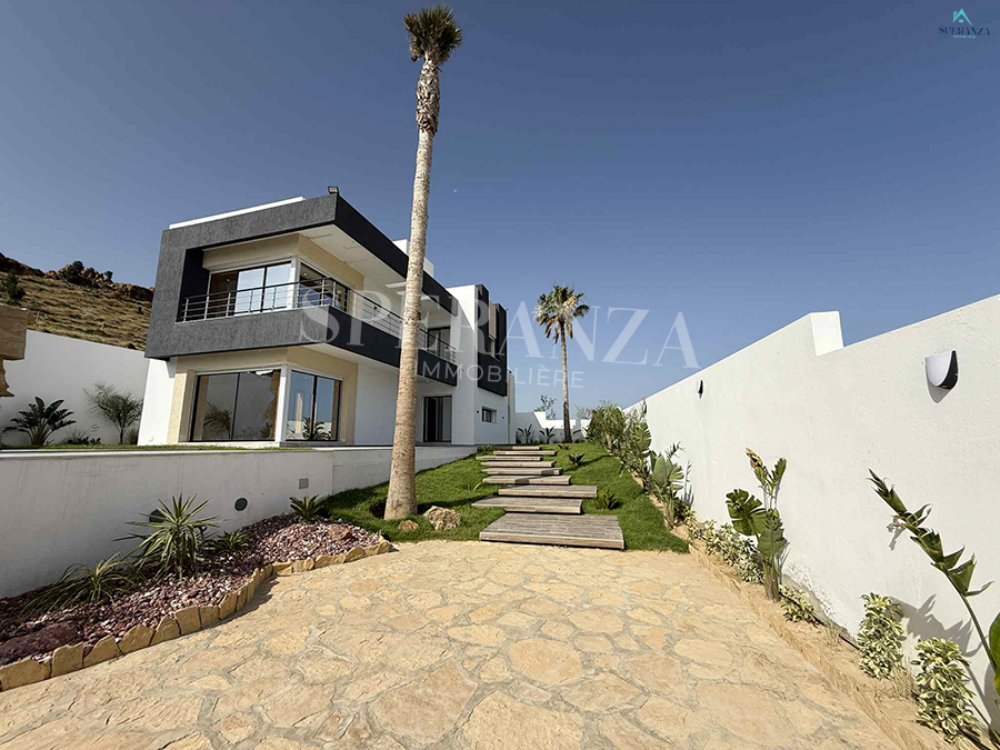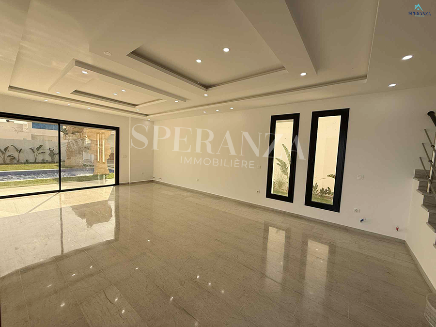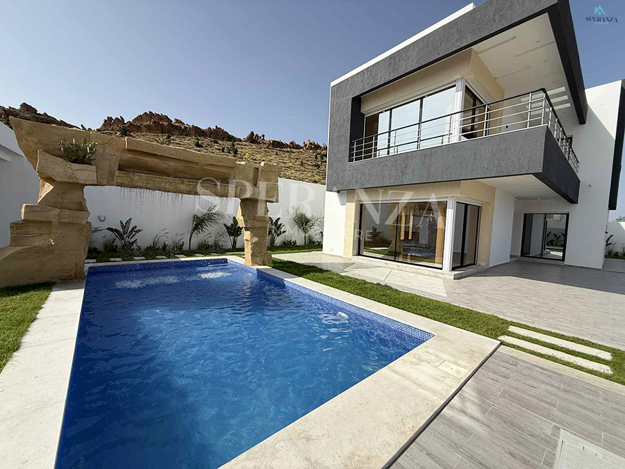 Speranza immobilière Hammamet vous propose à la vente cette villa situé à Hammamet Sud.L’entrée bénéficie d’un jardin gazonné avec un piscine.La partie jour est composée principalement d’un salon lumineux grâce à ses fenêtres qui offre une vue sur le jardin,une cuisine dispose de plusieurs éléments de rangement ,une suite parentale , une salle d’eau pour les invités. Un escalier nous mène au 1ér étage à la partie nuit qui se compose par une suite parentale et deux chambres à coucher et une salle d’eau. Ainsi qu’un terrasse.Quant à le deuxièmme étage disposoe d’un terrasse.