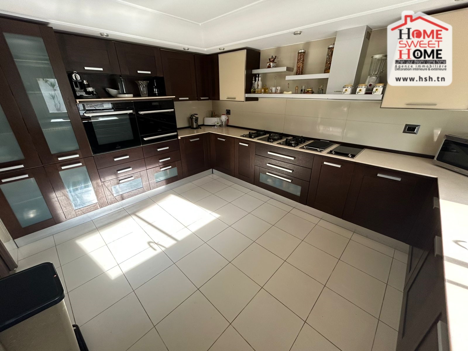 Une luxueuse villa avec piscine sur un terrain de 560 m² situé dans un quartier résidentiel à EL Manzah 8. Au RDJ, On trouve un séjour, une cuisine, une suite parentale et une salle de bain. Au RDC, On trouve un grand salon, salle à manger, une cuisine équipée et une suite parentale. Au 1er étage, On trouve un séjour, 2 chambres avec dressing, une salle d’eau, une kitchenette et une salle de bain. A L’extérieur, On a une terrasse, un jardin, un garage et un abris de voiture.