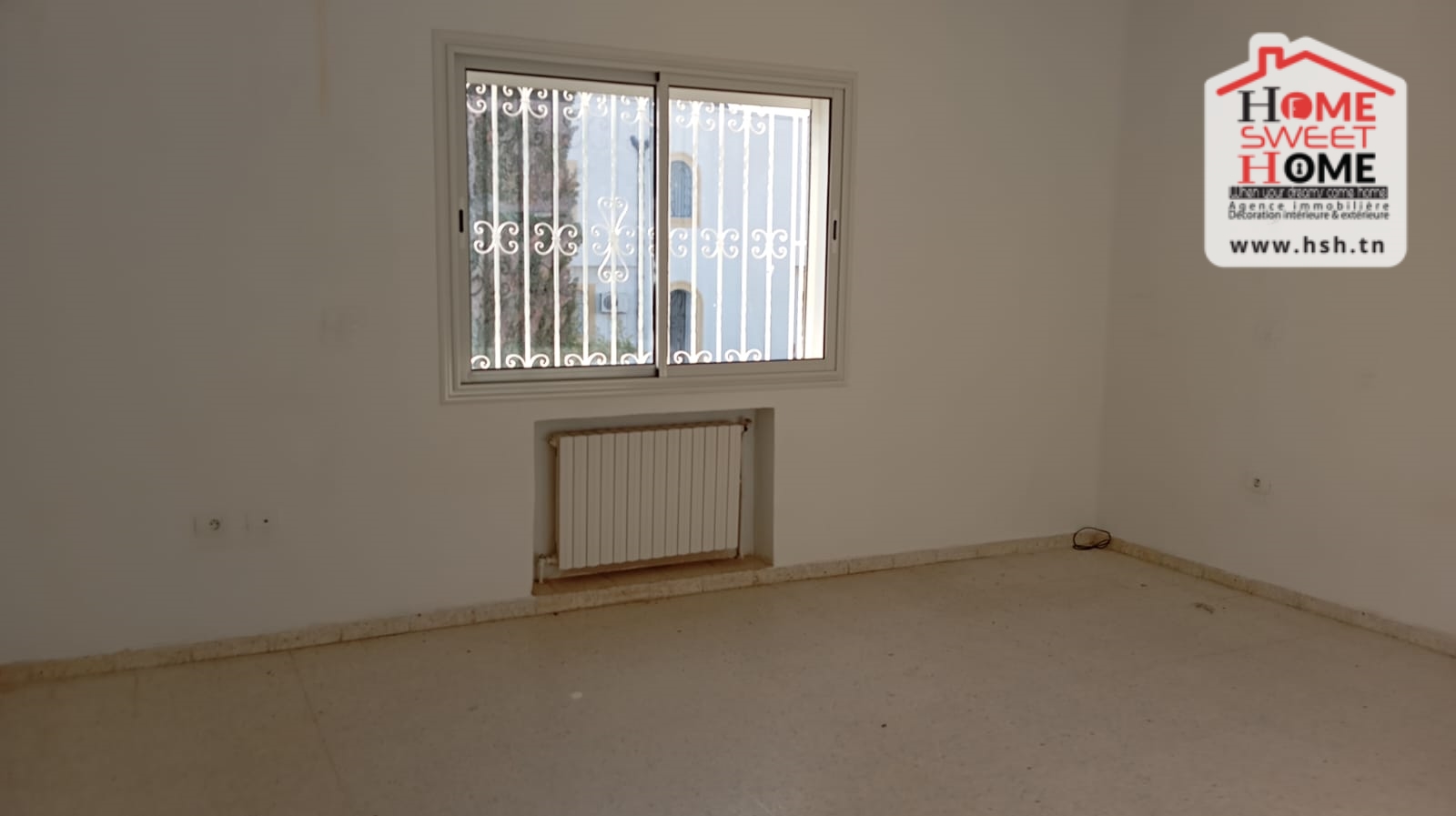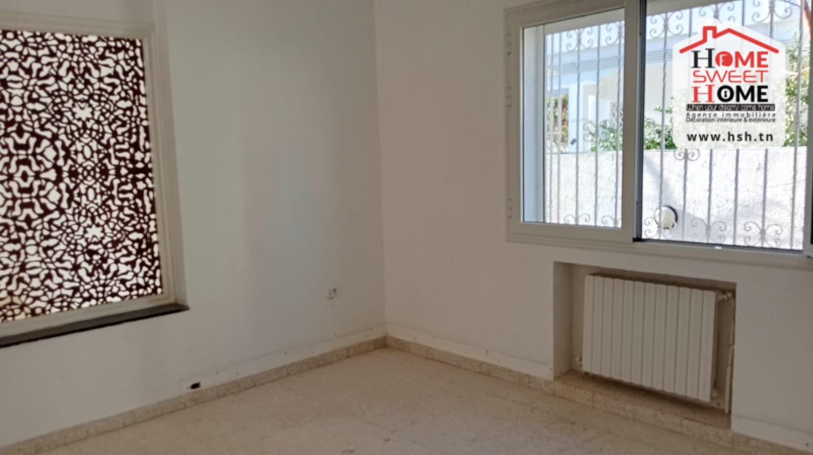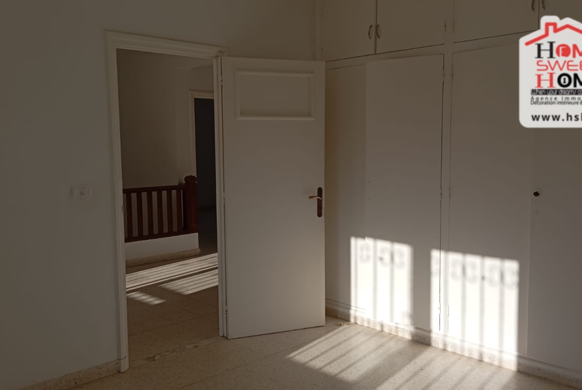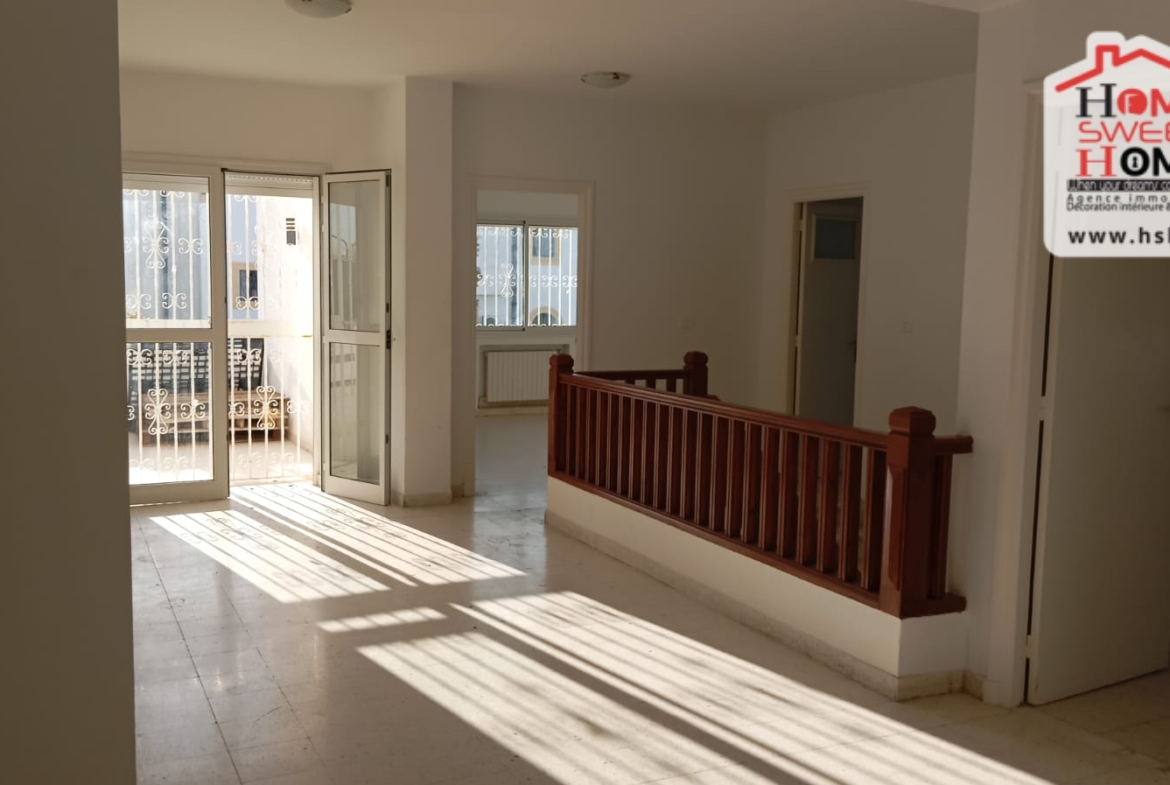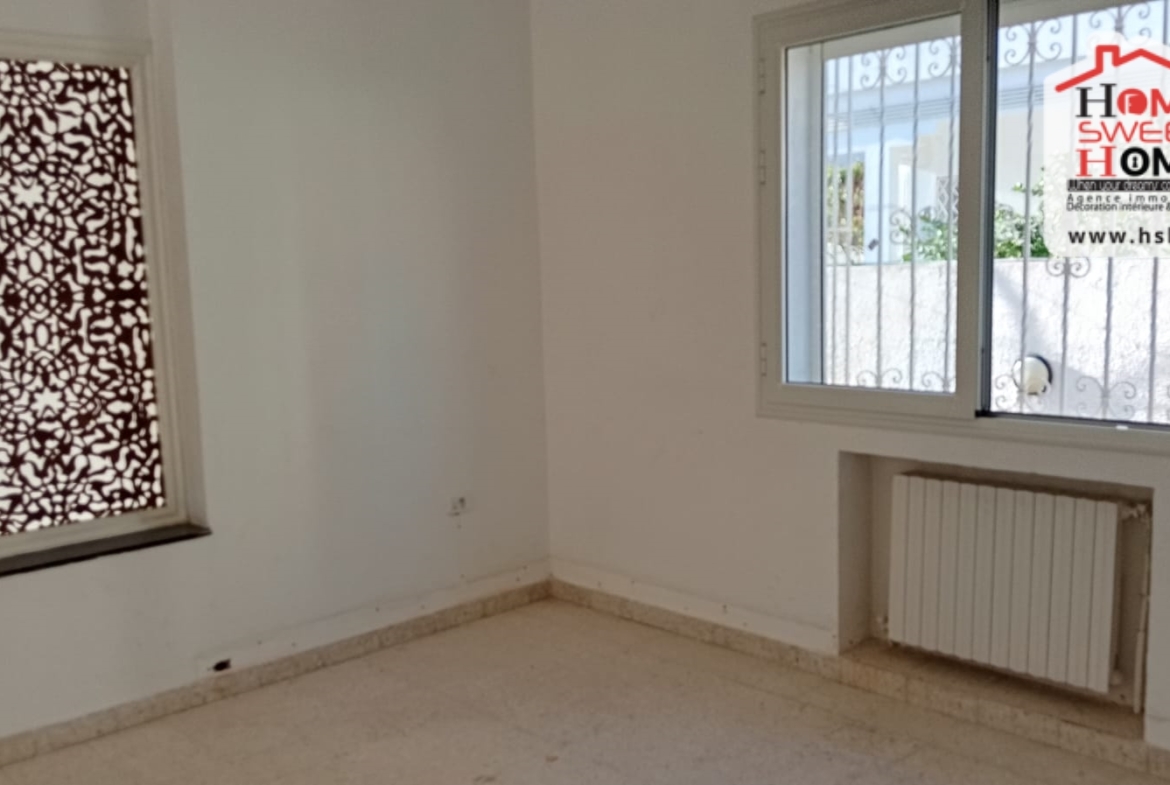 Une charmante villa jumelée d’un côté situé dans un quartier résidentiel très prisé à Riadh EL Andalous. Au RDJ, On trouve un débarras et un parking de voiture. Au RDC, On trouve un double salon, séjour, une salle à manger, une cuisine équipée avec séchoir et une salle d’eau pour les invités. A L’étage, On trouve 4 chambres, un bureau, une salle de bain et un balcon. A L’extérieur, On a une terrasse, un jardin et un abris de voiture.