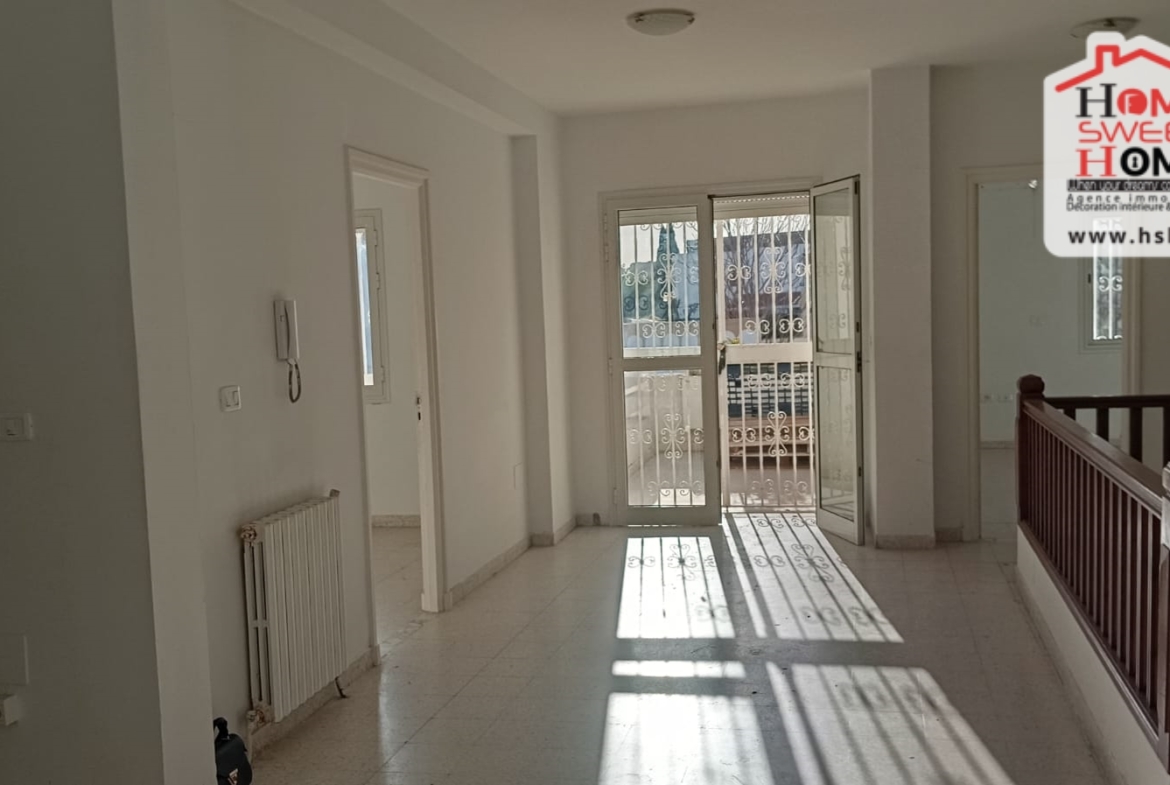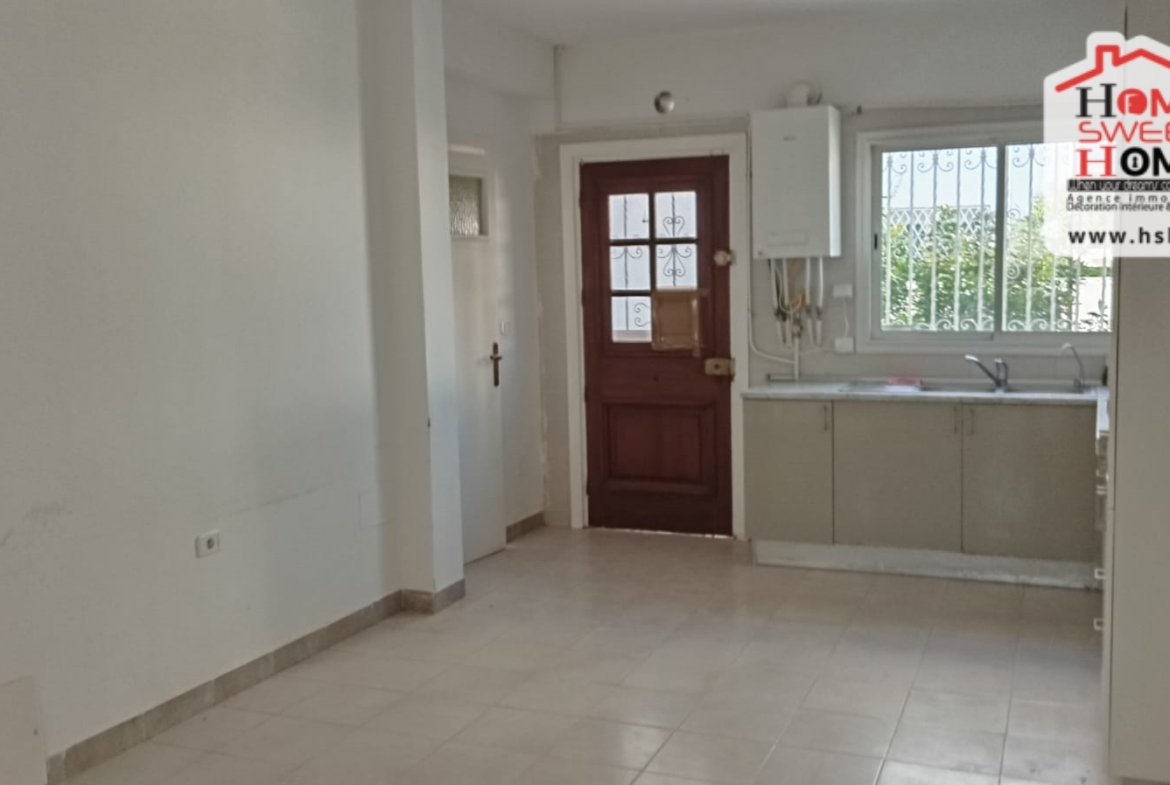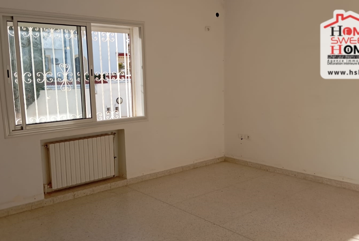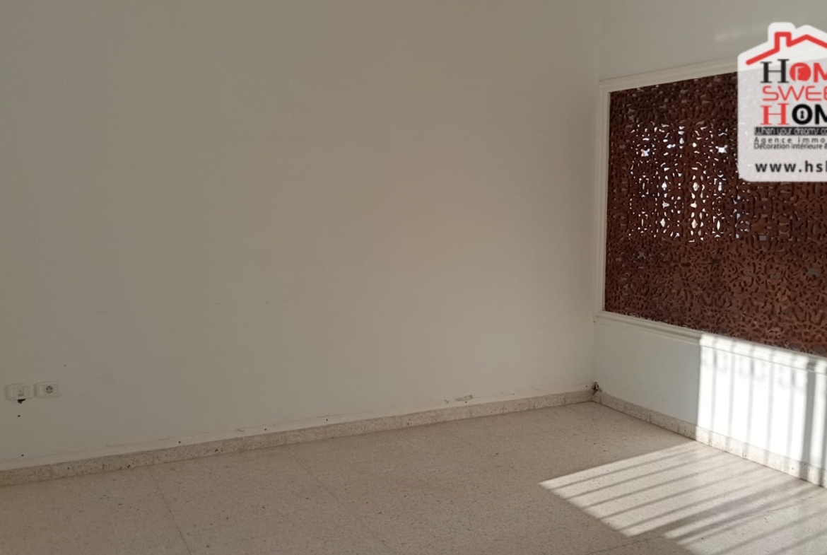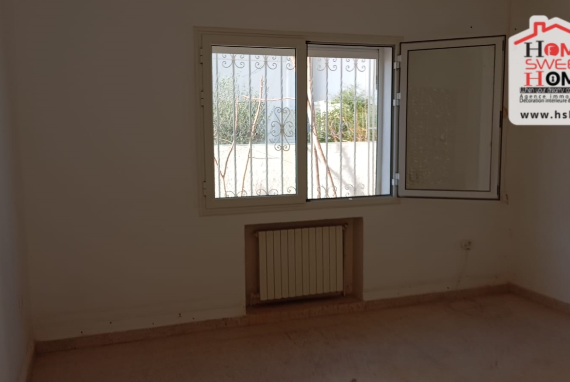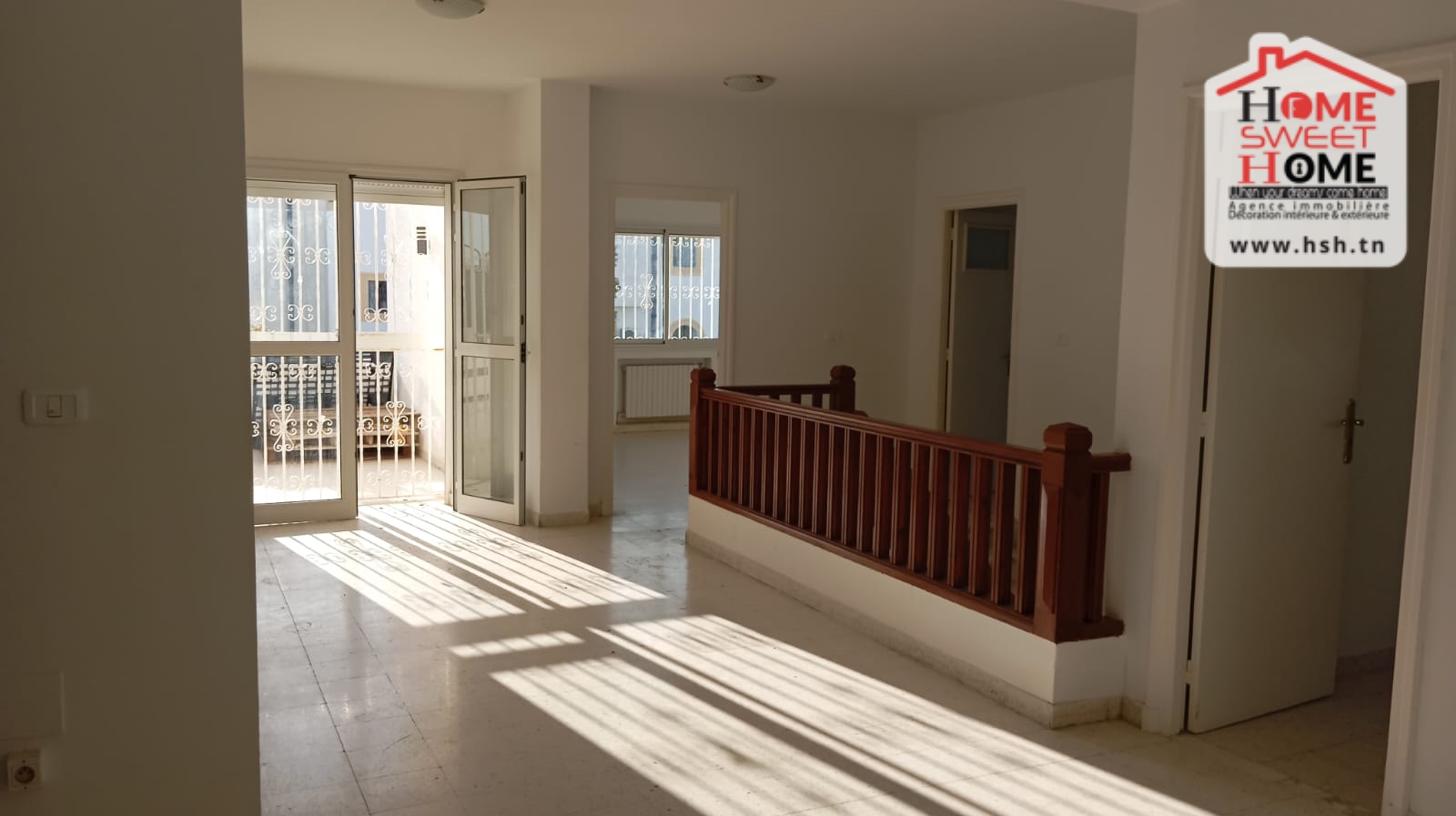 Une charmante villa jumelée d’un côté situé dans un quartier résidentiel très prisé à Riadh EL Andalous. Au RDJ, On trouve un débarras et un parking de voiture. Au RDC, On trouve un double salon, séjour, une salle à manger, une cuisine équipée avec séchoir et une salle d’eau pour les invités. A L’étage, On trouve 4 chambres, un bureau, une salle de bain et un balcon. A L’extérieur, On a une terrasse, un jardin et un abris de voiture.