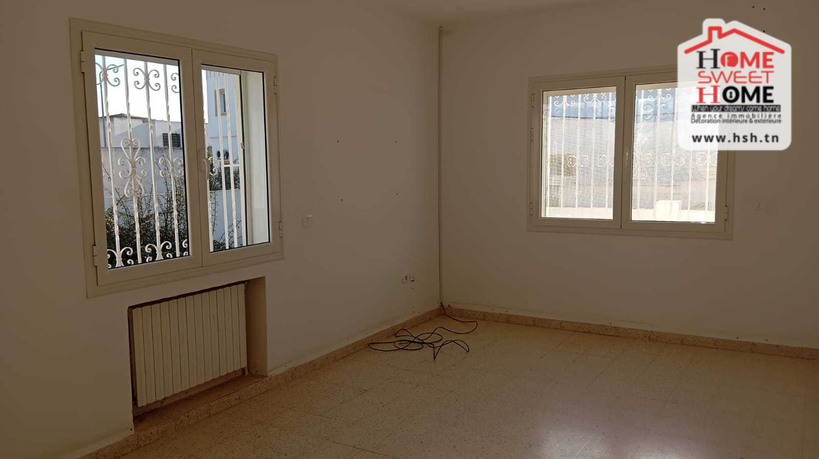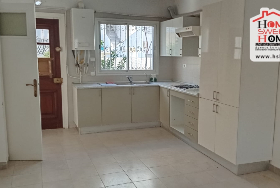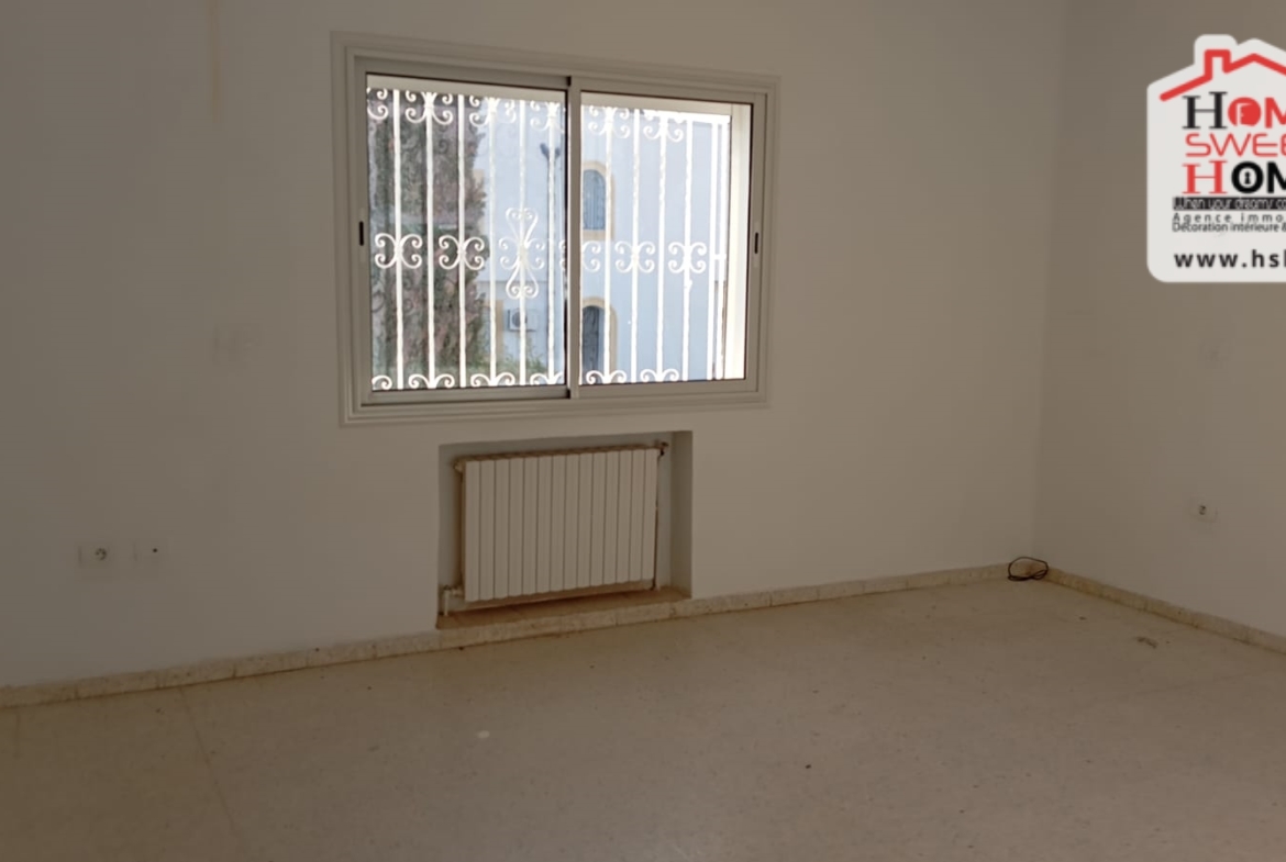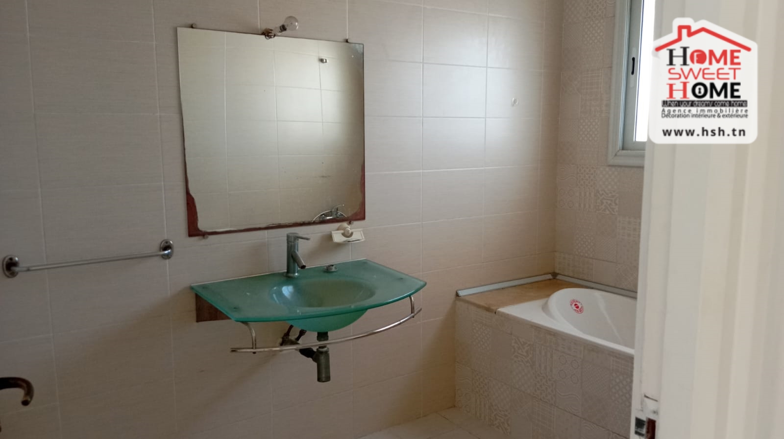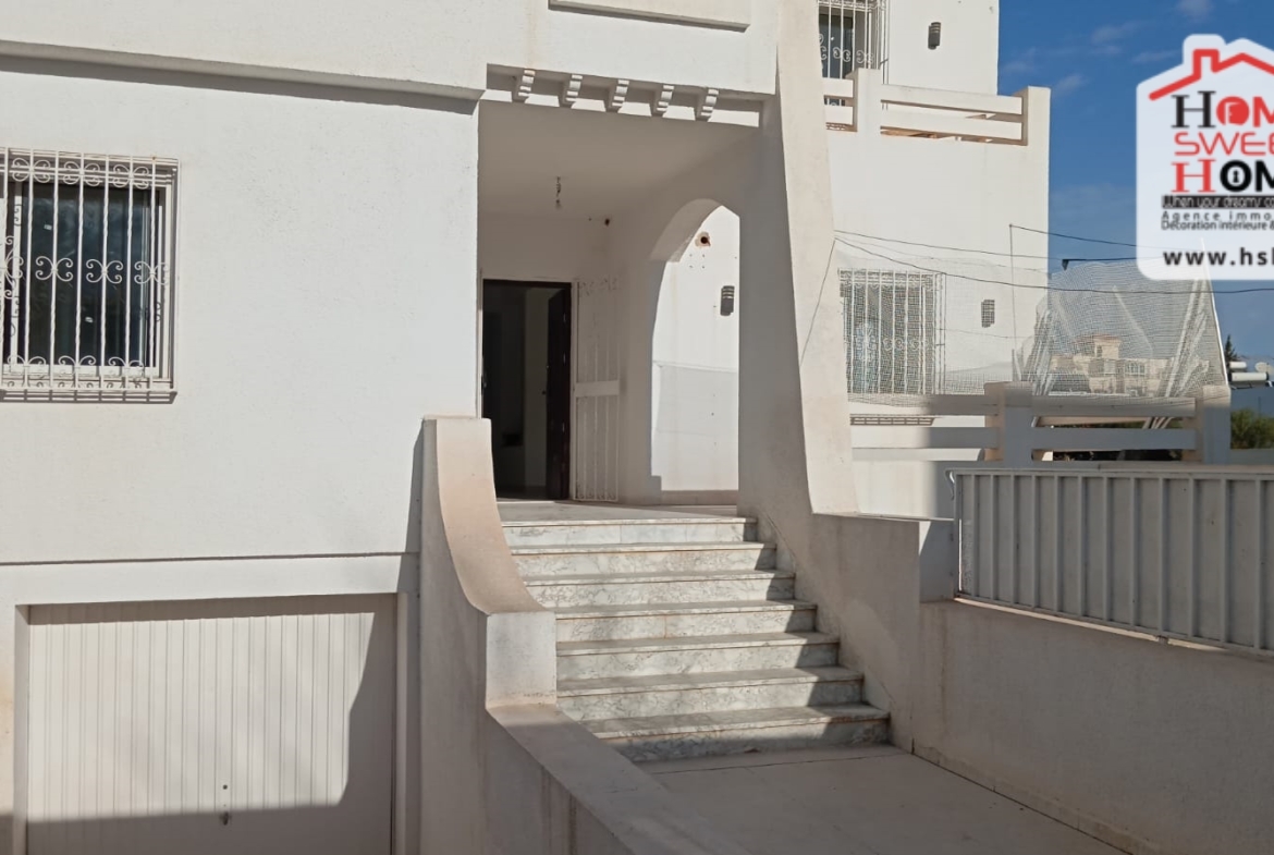 Une charmante villa jumelée d’un côté situé dans un quartier résidentiel très prisé à Riadh EL Andalous. Au RDJ, On trouve un débarras et un parking de voiture. Au RDC, On trouve un double salon, séjour, une salle à manger, une cuisine équipée avec séchoir et une salle d’eau pour les invités. A L’étage, On trouve 4 chambres, un bureau, une salle de bain et un balcon. A L’extérieur, On a une terrasse, un jardin et un abris de voiture.