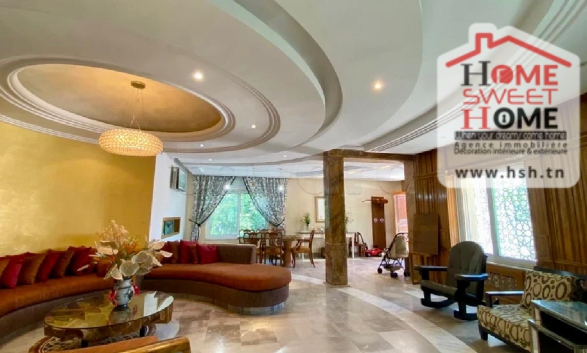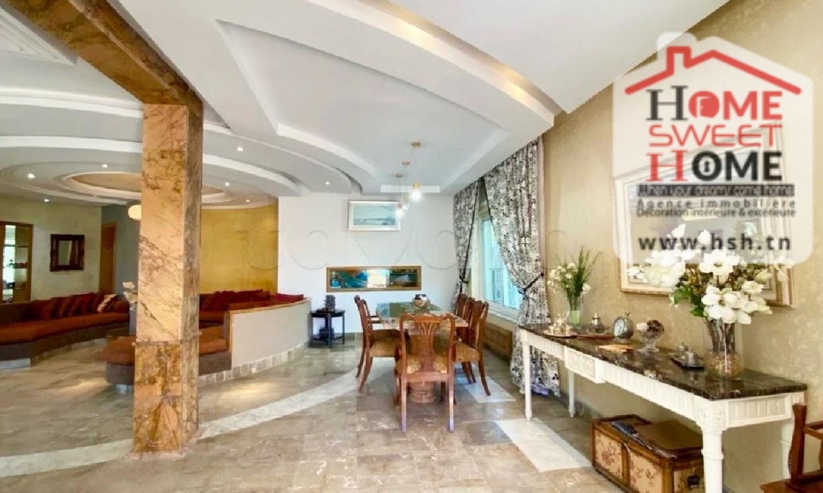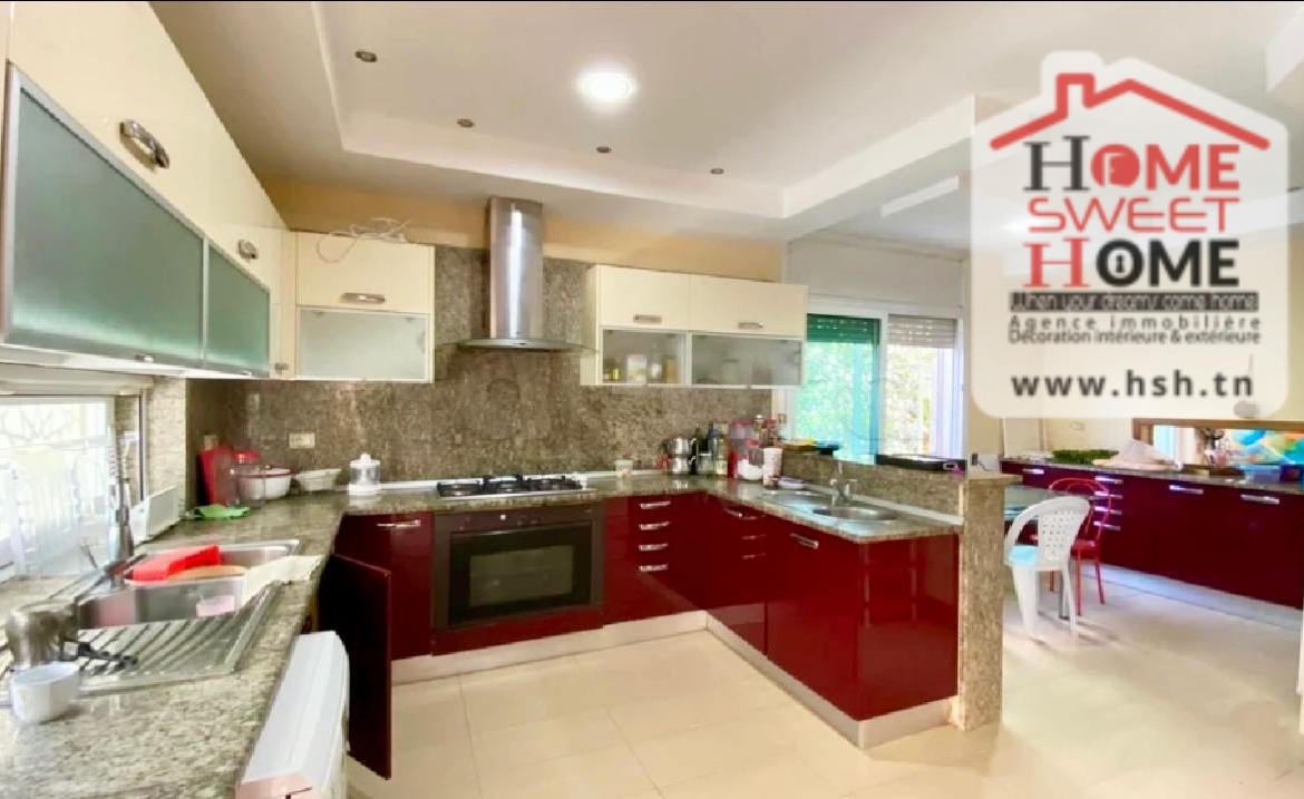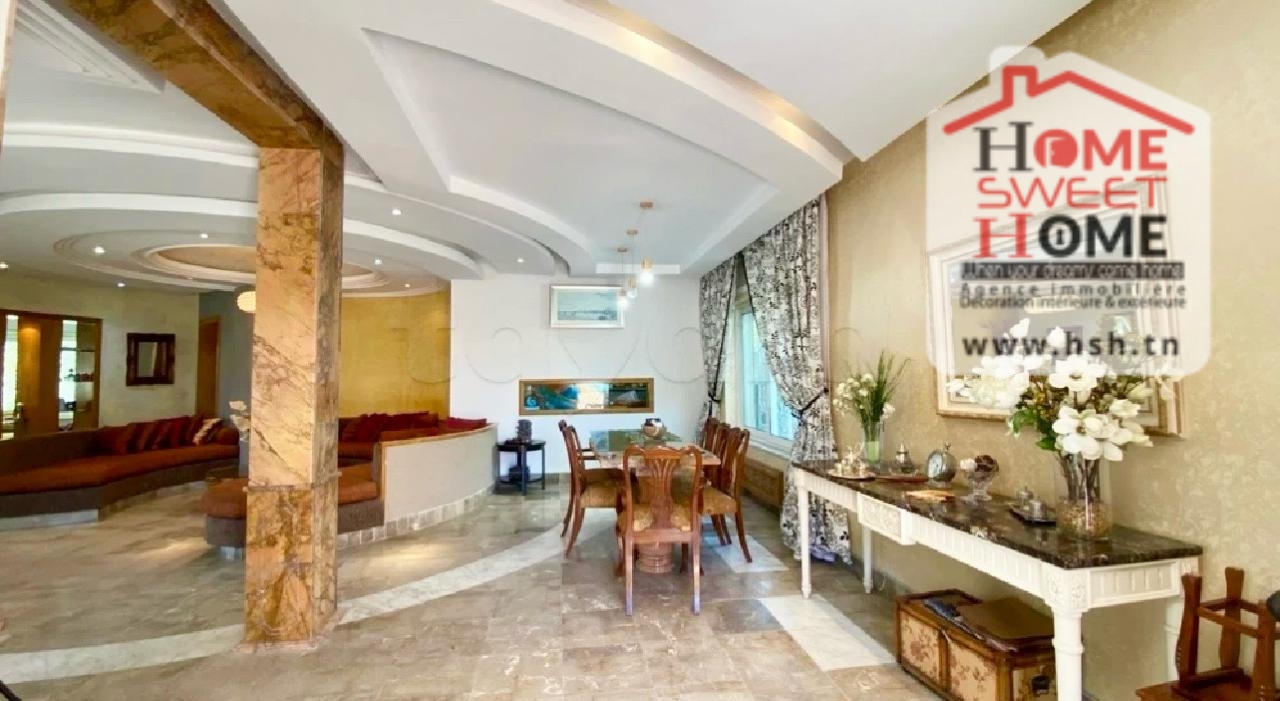 Une Villa Haut standing avec piscine sur un terrain d’une superficie de 624 m² situé aux Jardins de L’Aouina . Au RDJ, on a un grand open space. Au RDC, on a un salon spacieux, une salle à manger, une cuisine équipée et une salle d’eau pour les invités. Au 1er étage, on a une suite parentale, 3 chambres à coucher avec dressings et une salle de bain. A L’extérieur, on a une grande terrasse, un jardin et un abri de voiture.